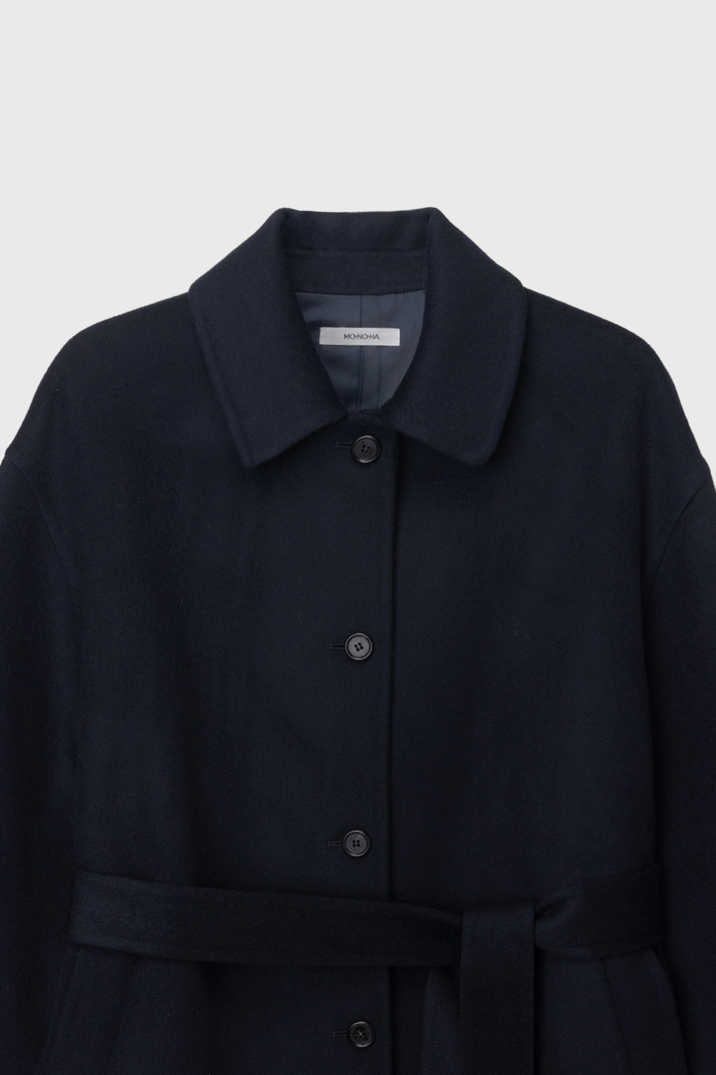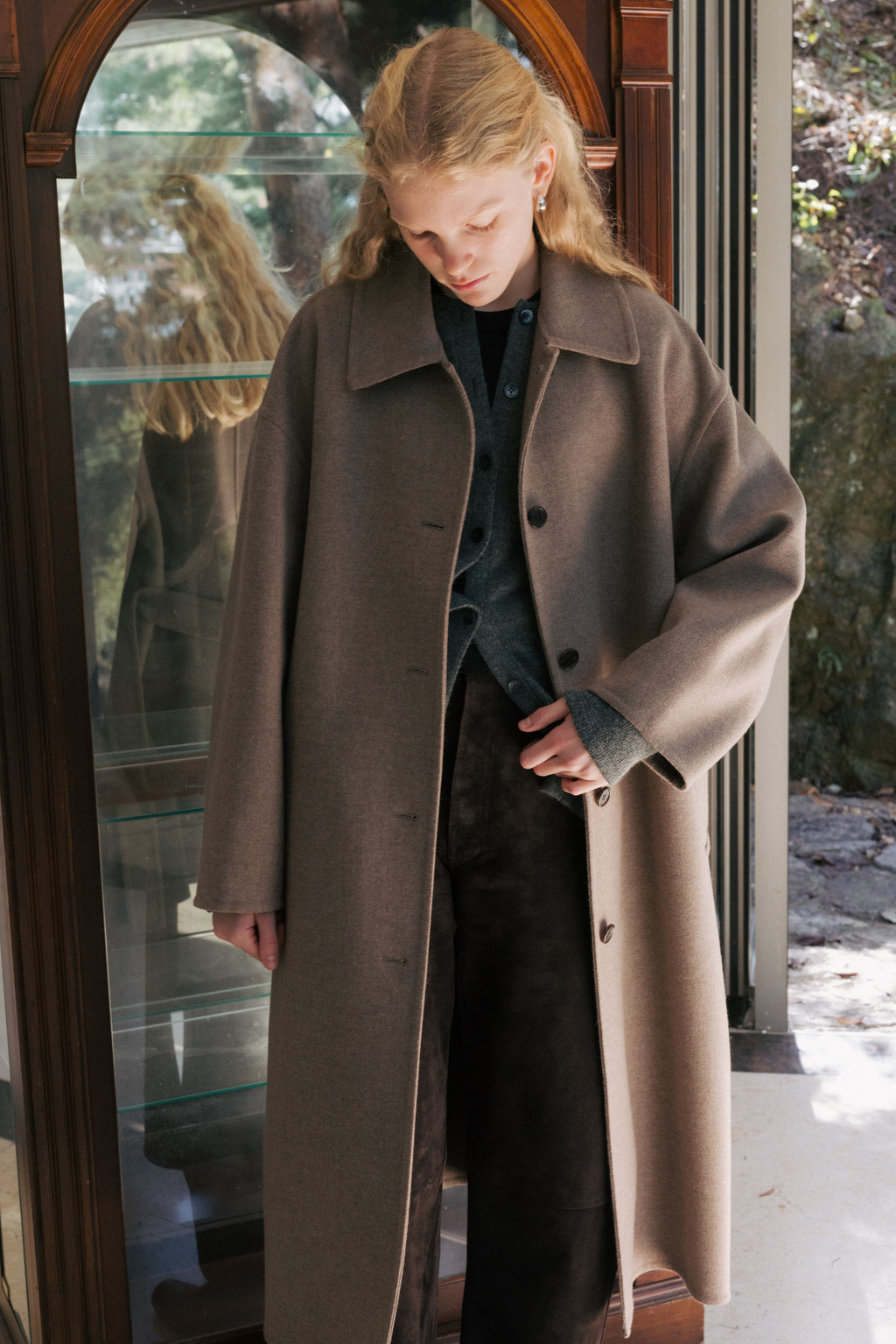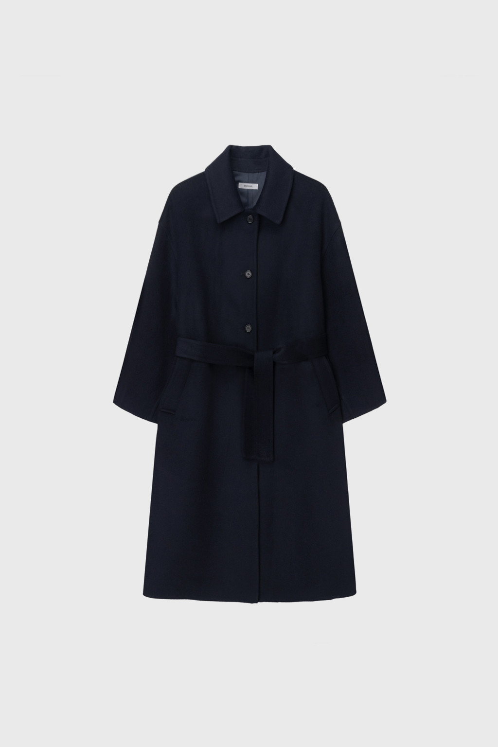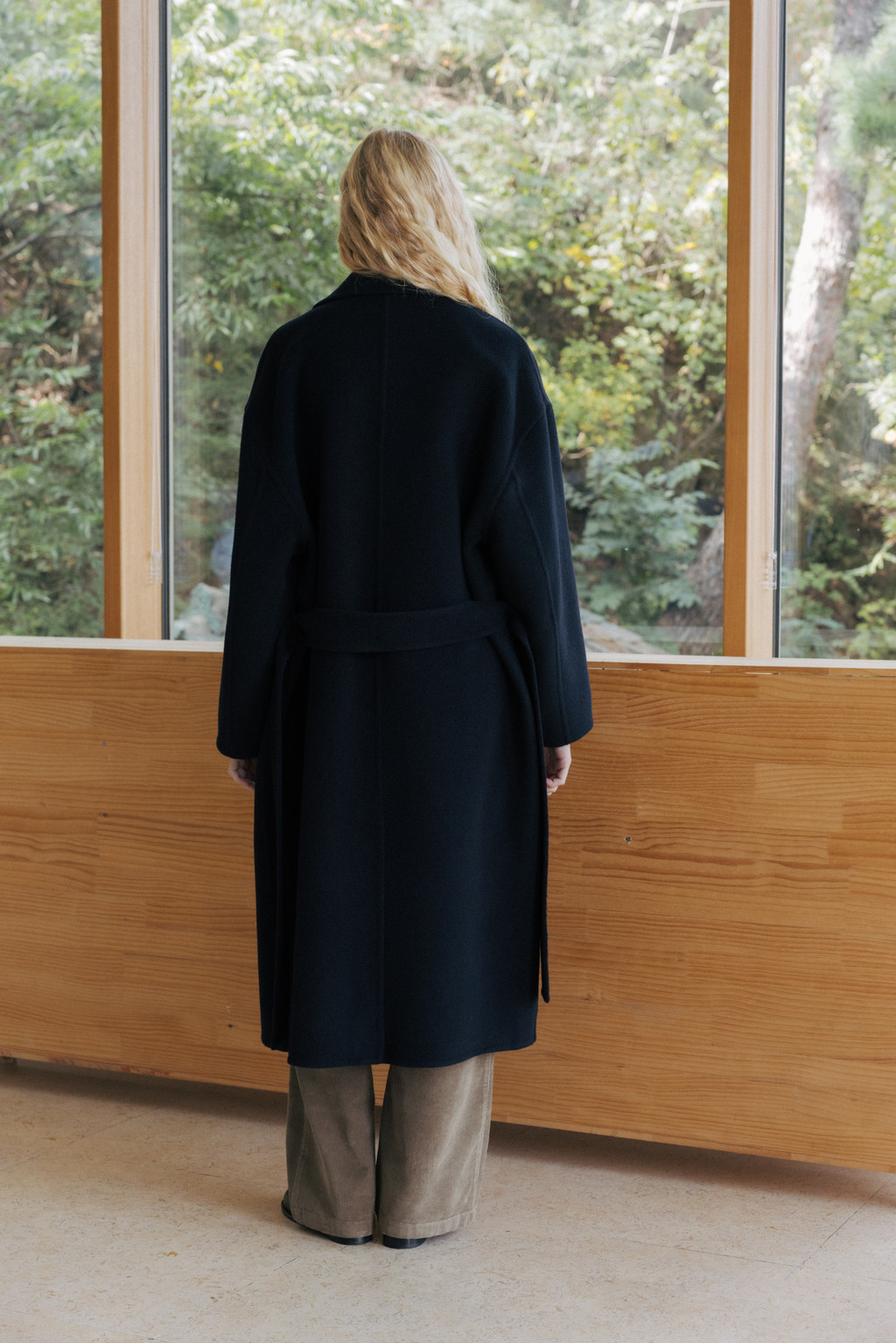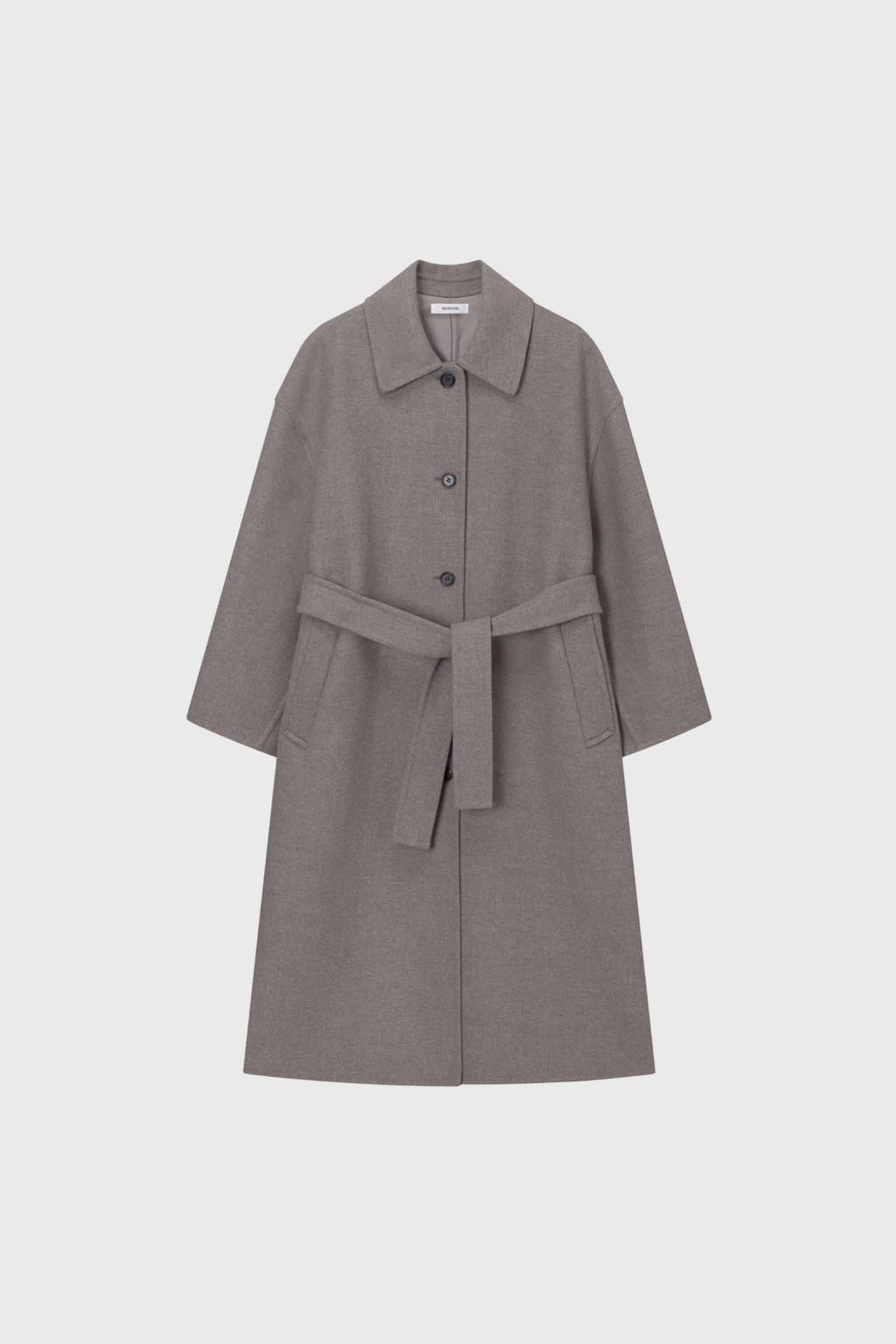 This single coat is made from a double-faced cashmere-blend fabric in a subtle melange beige tone. Fully handcrafted with meticulous finishing, it features a lined body and sleeves for a stable and comfortable fit. The classic single-collar design and relaxed wide silhouette create a natural and understated look. Despite its light weight, the coat provides excellent warmth, making it suitable from transitional seasons through winter. A detachable waist belt allows for adjustable styling and silhouette variation.