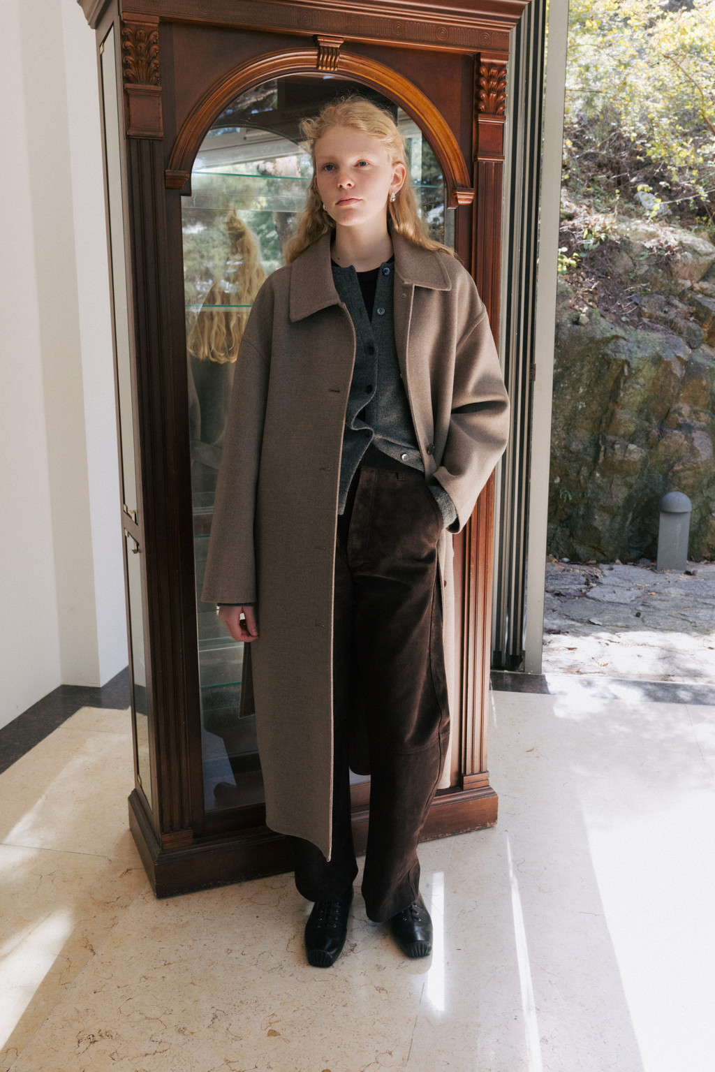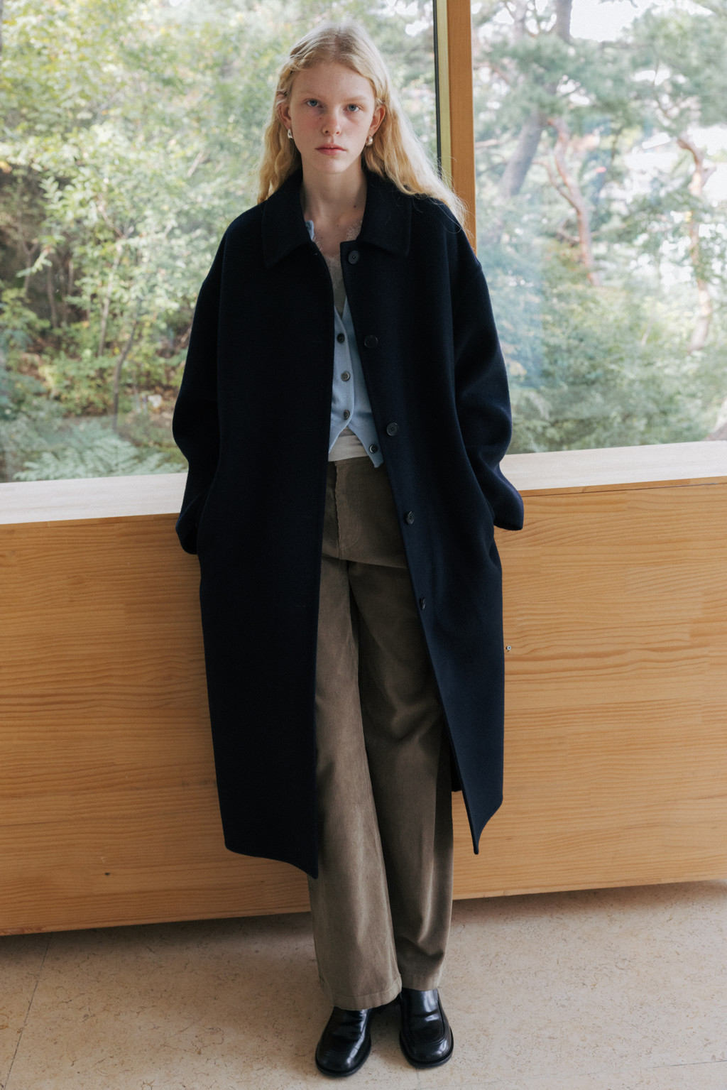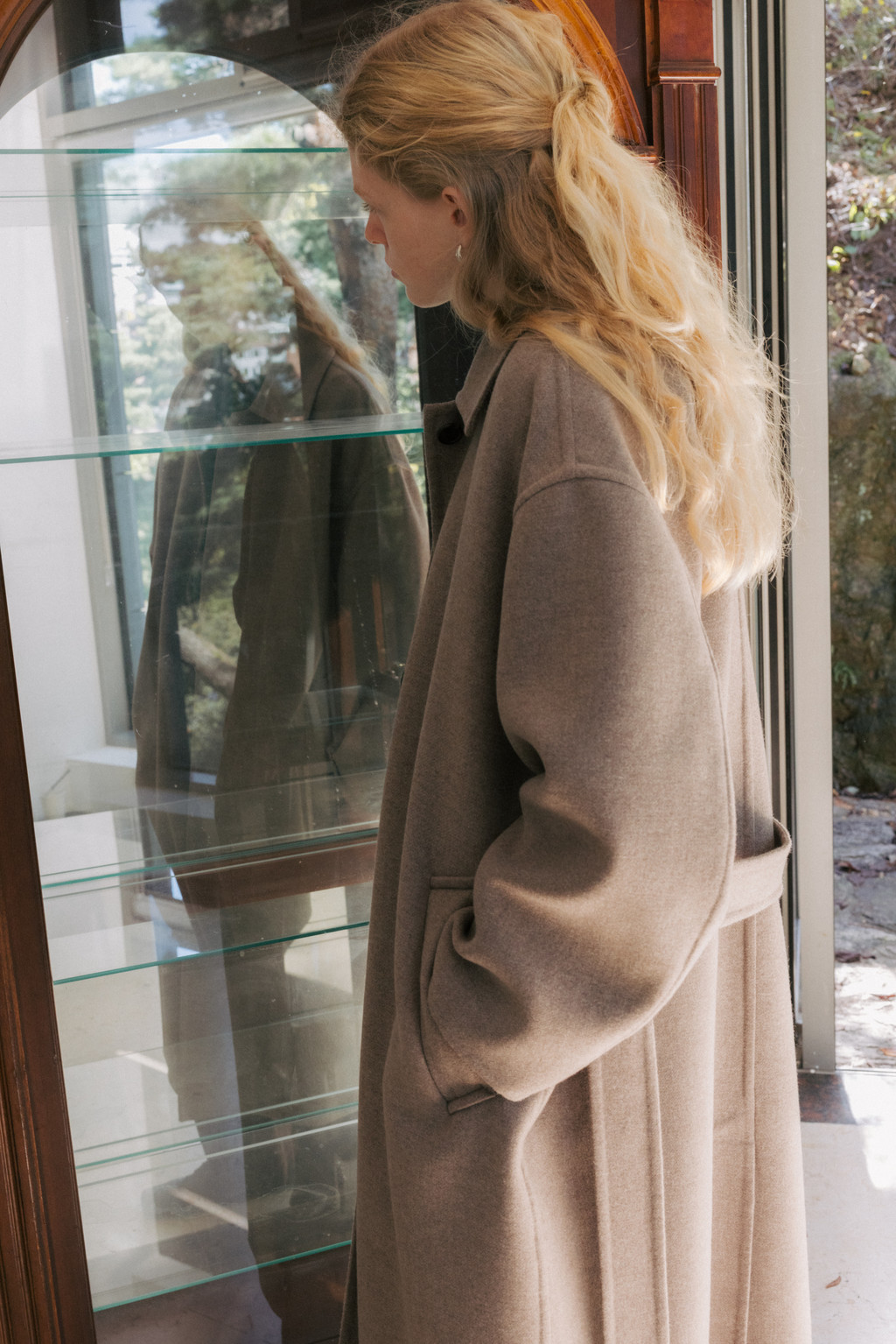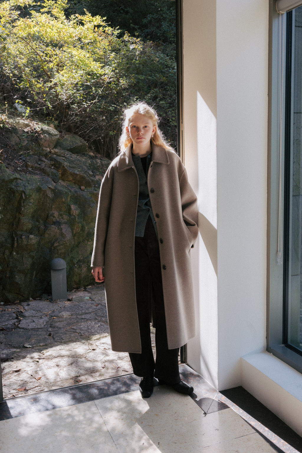 This single coat is made from a double-faced cashmere-blend fabric in a subtle melange beige tone. Fully handcrafted with meticulous finishing, it features a lined body and sleeves for a stable and comfortable fit. The classic single-collar design and relaxed wide silhouette create a natural and understated look. Despite its light weight, the coat provides excellent warmth, making it suitable from transitional seasons through winter. A detachable waist belt allows for adjustable styling and silhouette variation.