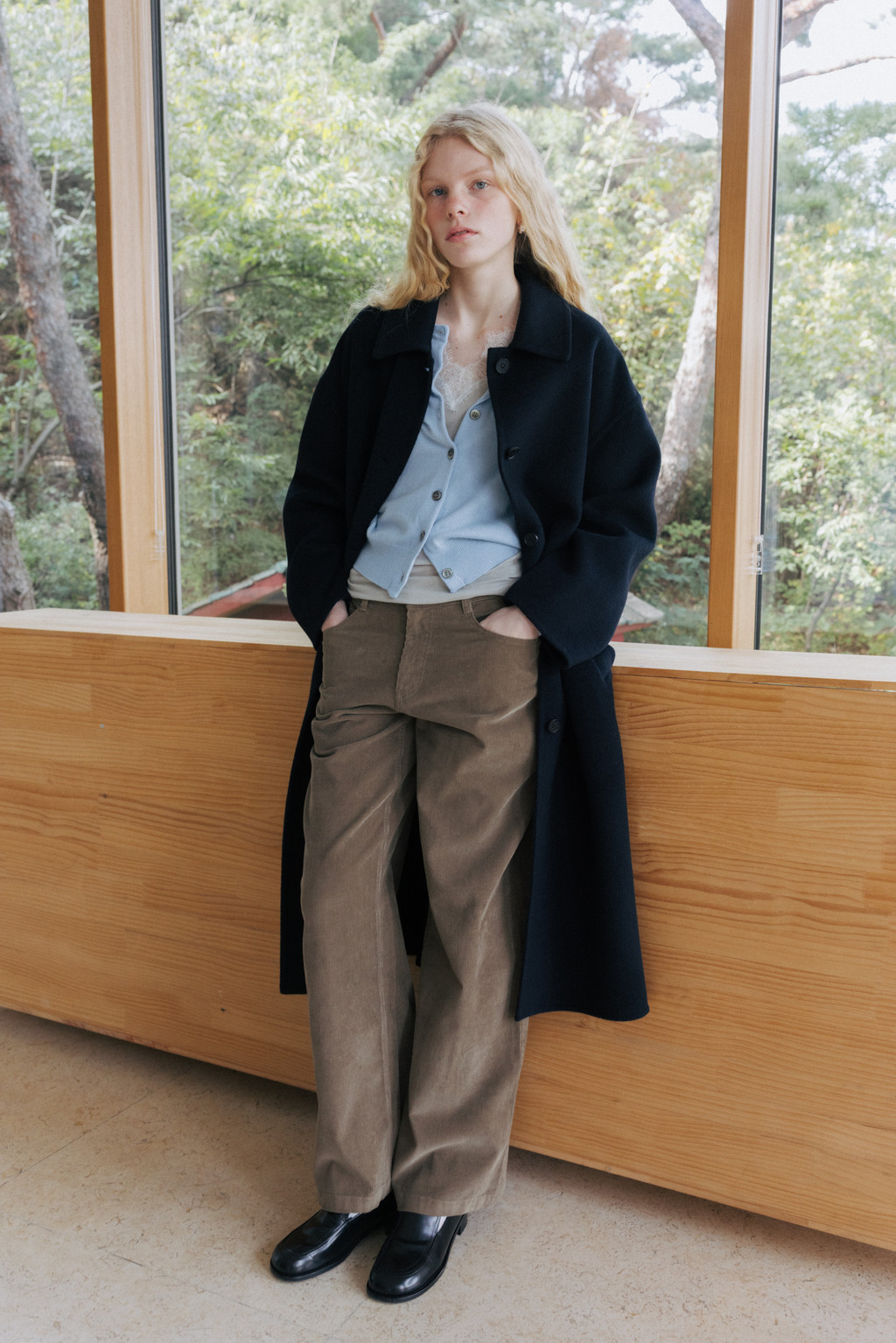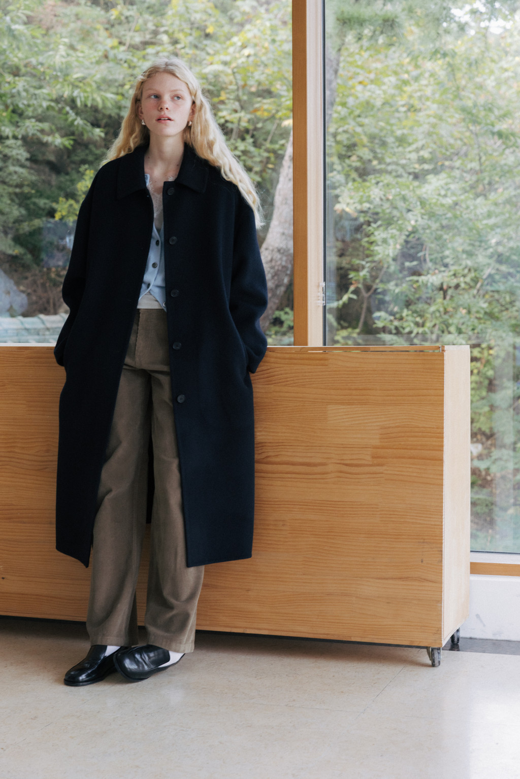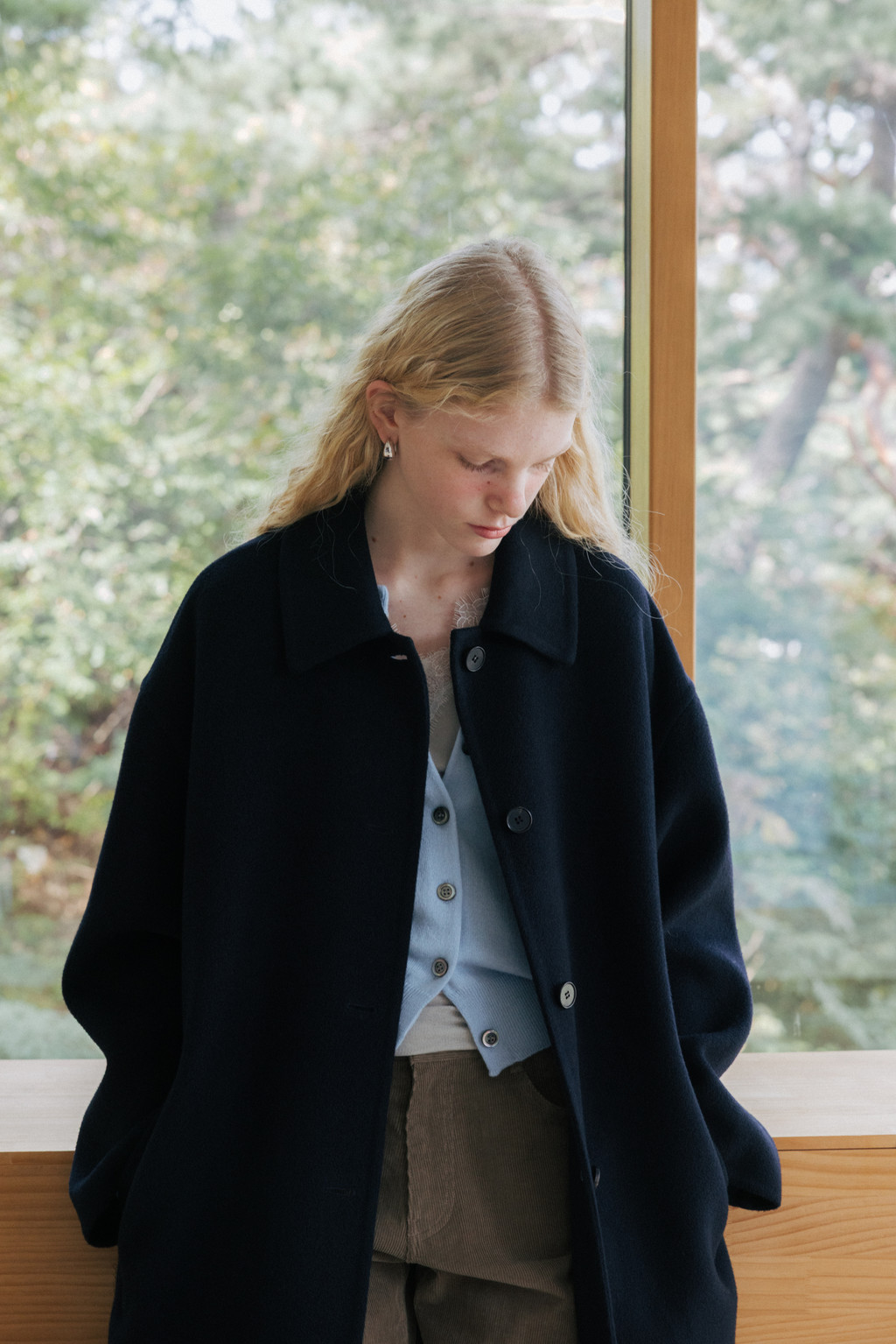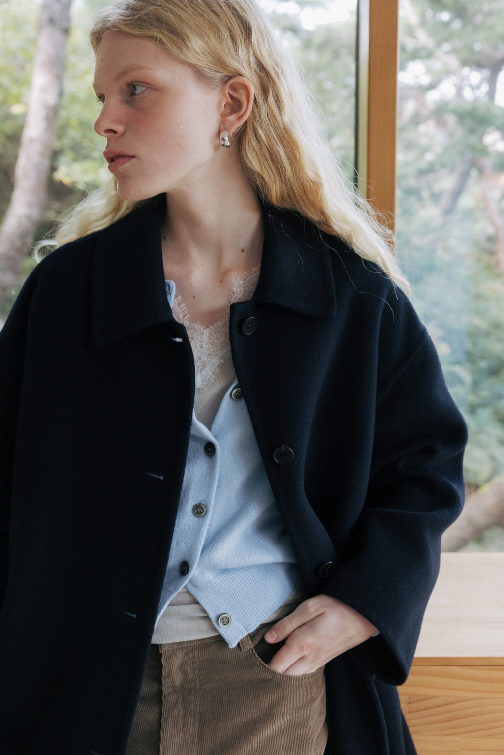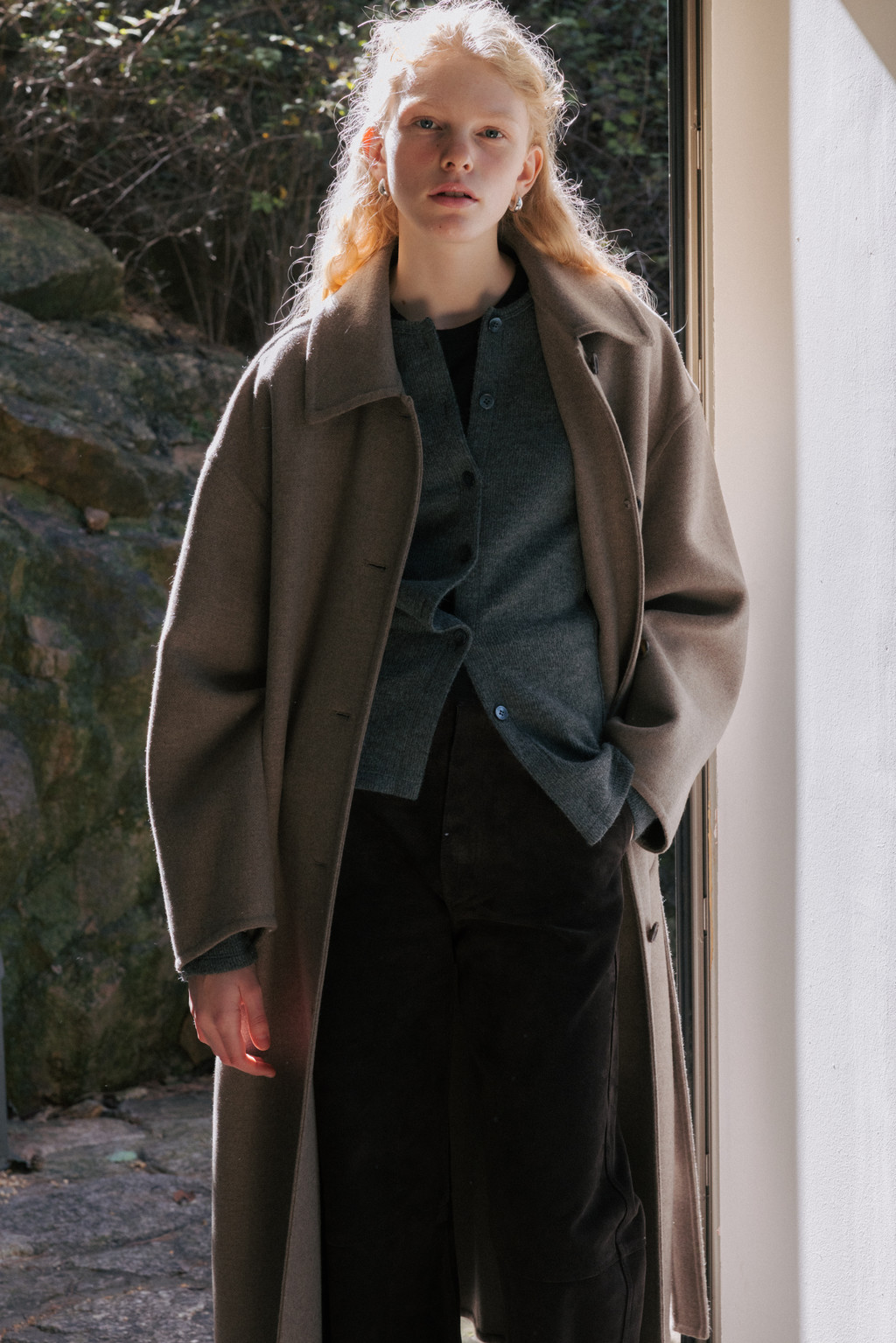 This single coat is made from a double-faced cashmere-blend fabric in a subtle melange beige tone. Fully handcrafted with meticulous finishing, it features a lined body and sleeves for a stable and comfortable fit. The classic single-collar design and relaxed wide silhouette create a natural and understated look. Despite its light weight, the coat provides excellent warmth, making it suitable from transitional seasons through winter. A detachable waist belt allows for adjustable styling and silhouette variation.