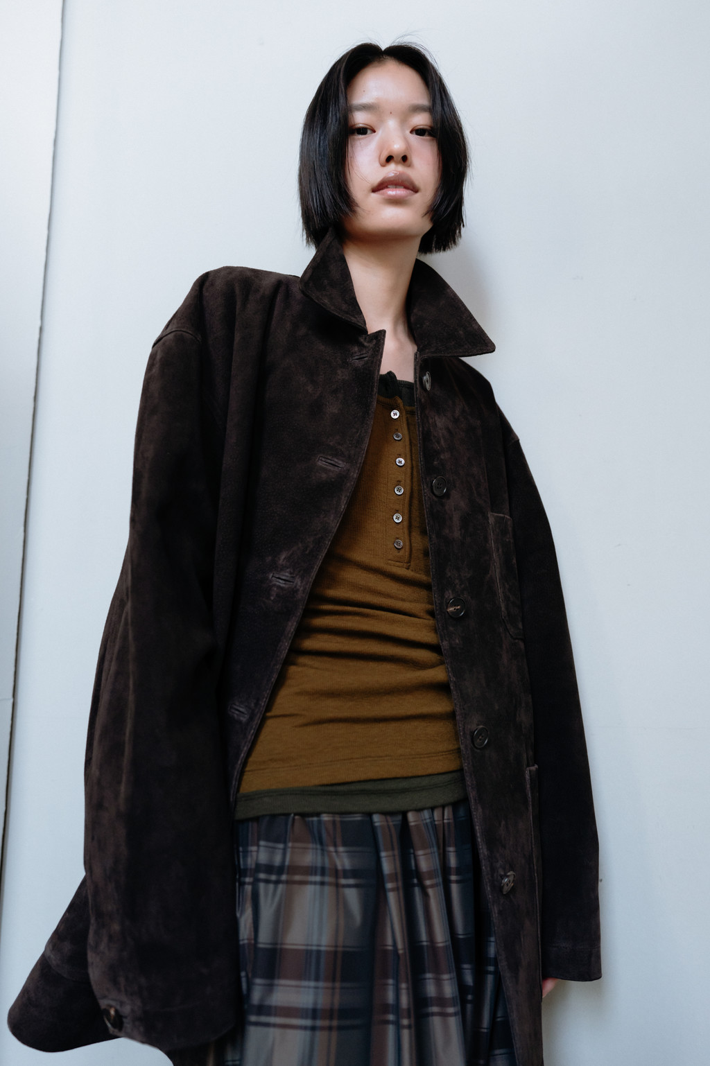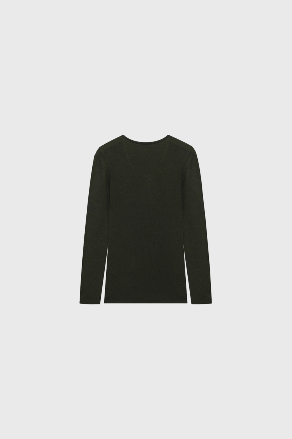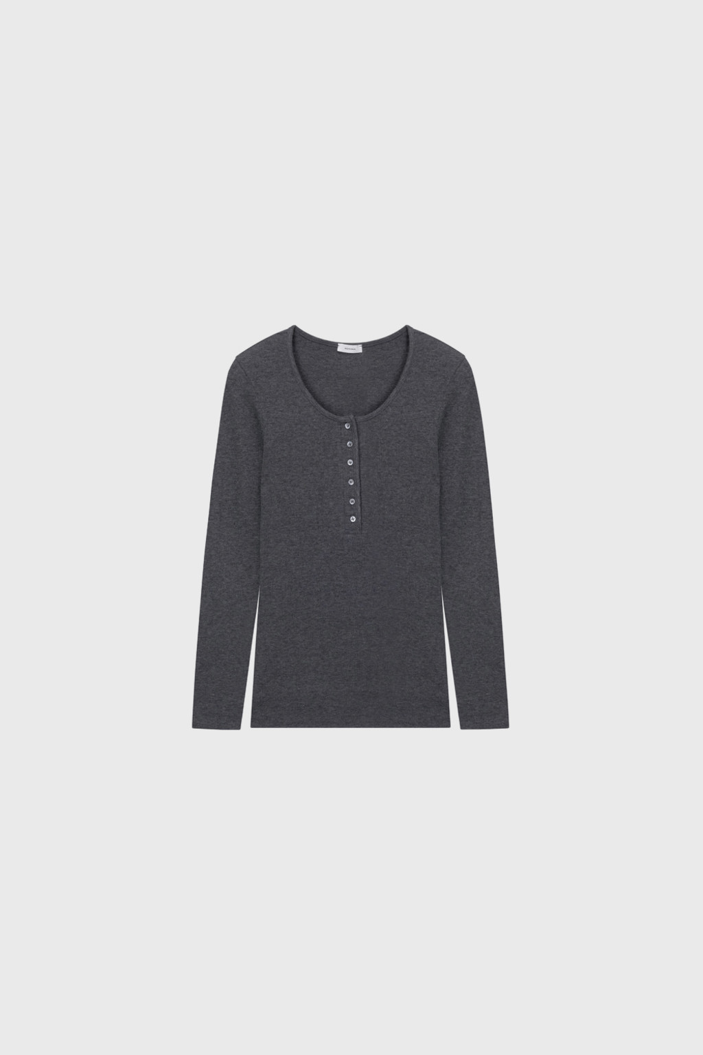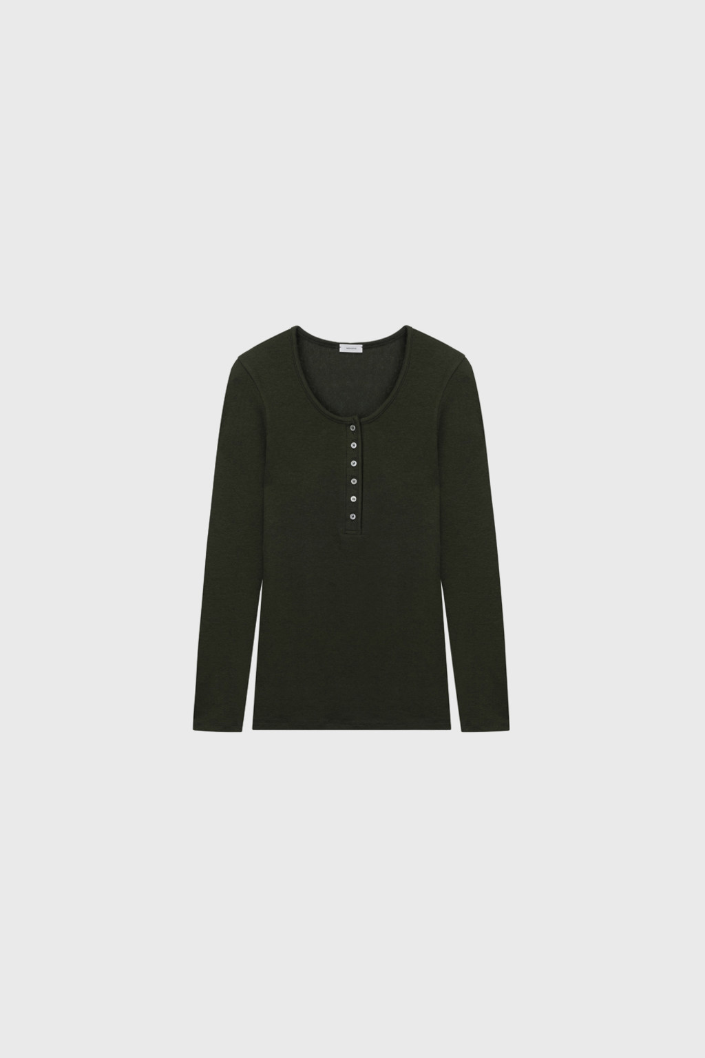 This henley tee features a slim fit that hugs the body. Crafted from a soft, ribbed jersey fabric, it boasts excellent stretch and a warm feel. It features a round neck with a front button, and three-dimensional curved darts on the sleeves create a soft, rounded silhouette that follows the arm line.