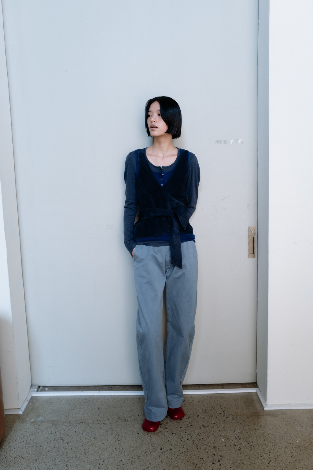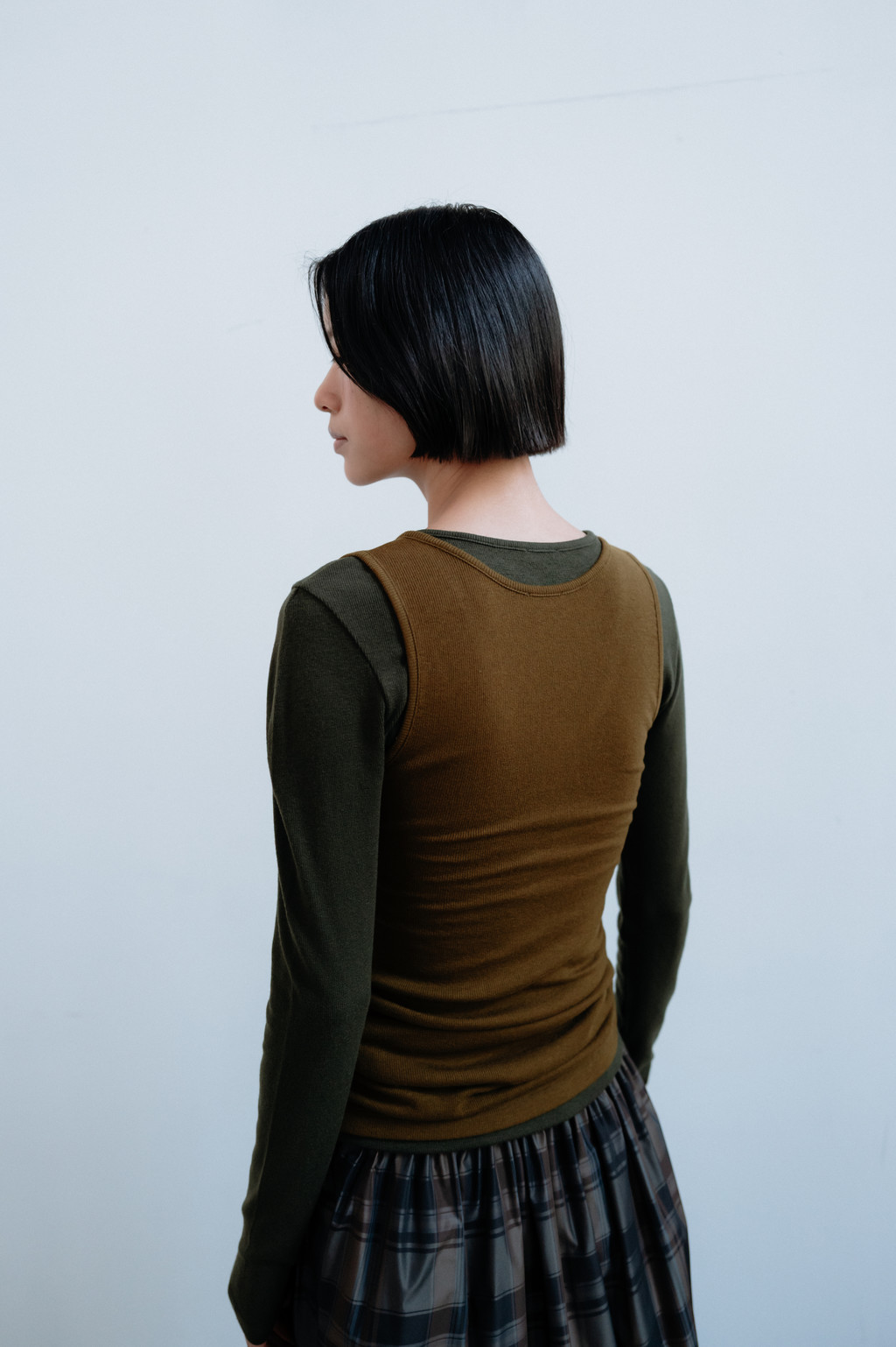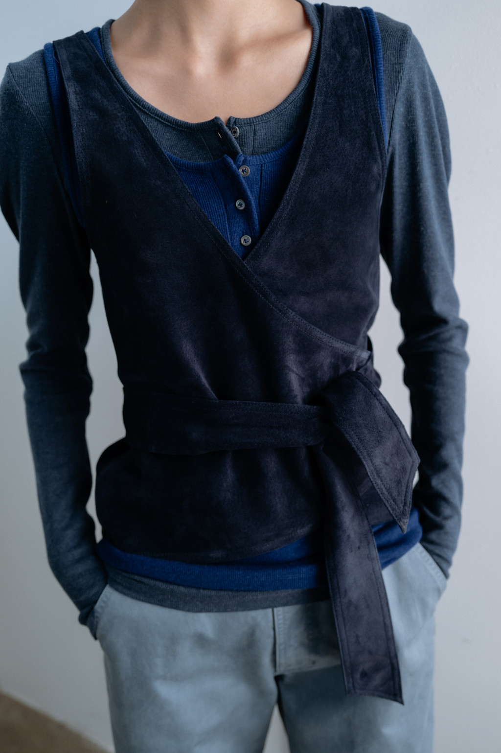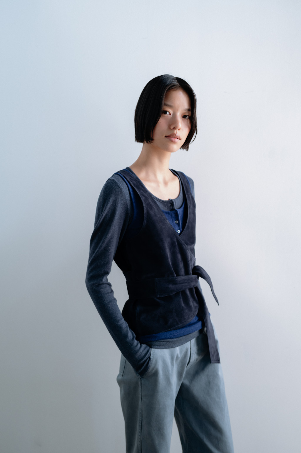 This henley tee features a slim fit that hugs the body. Crafted from a soft, ribbed jersey fabric, it boasts excellent stretch and a warm feel. It features a round neck with a front button, and three-dimensional curved darts on the sleeves create a soft, rounded silhouette that follows the arm line.