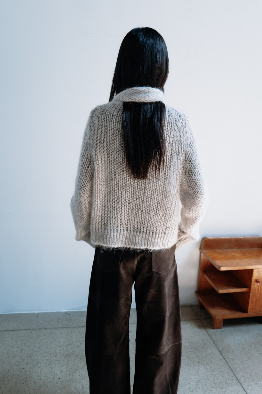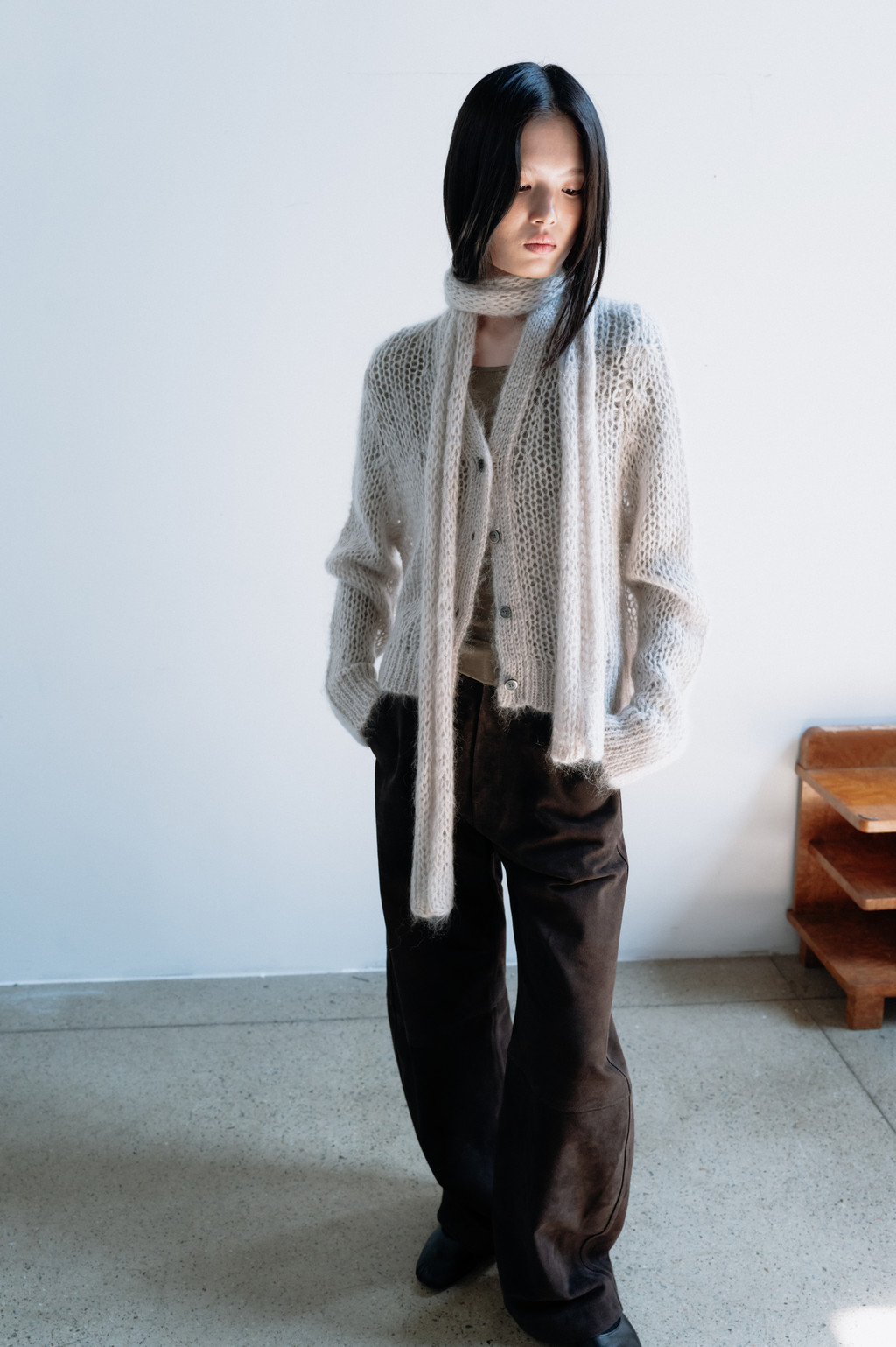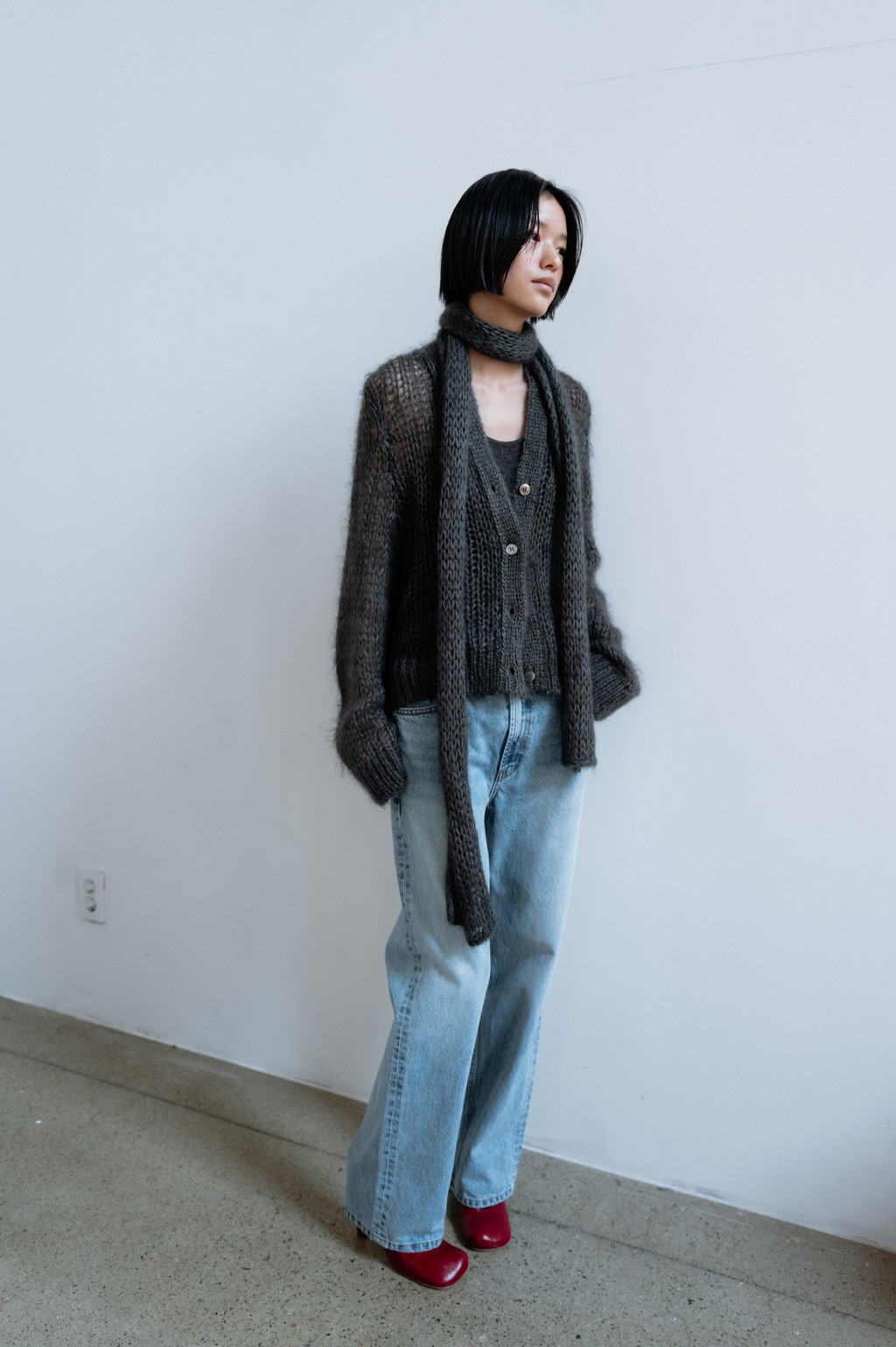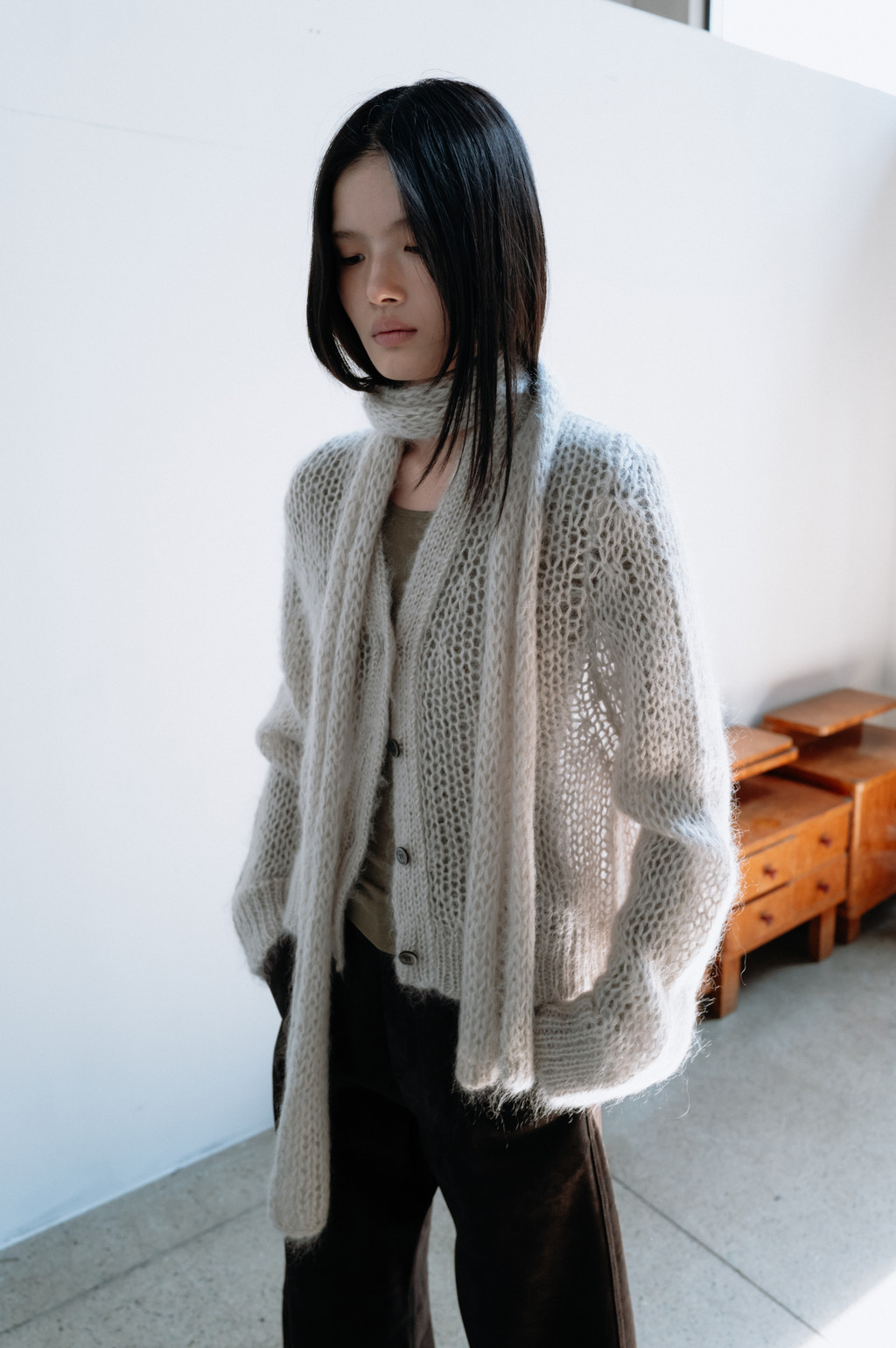 This cardigan is crafted from multiple layers of fine mohair yarn, creating a soft feel and voluminous volume. Crafted from a mohair blend yarn with a subtle, hairy texture, it's perfect for layering over sleeveless tops during the transitional season. The moderately length V-neck design complements a variety of bottoms.