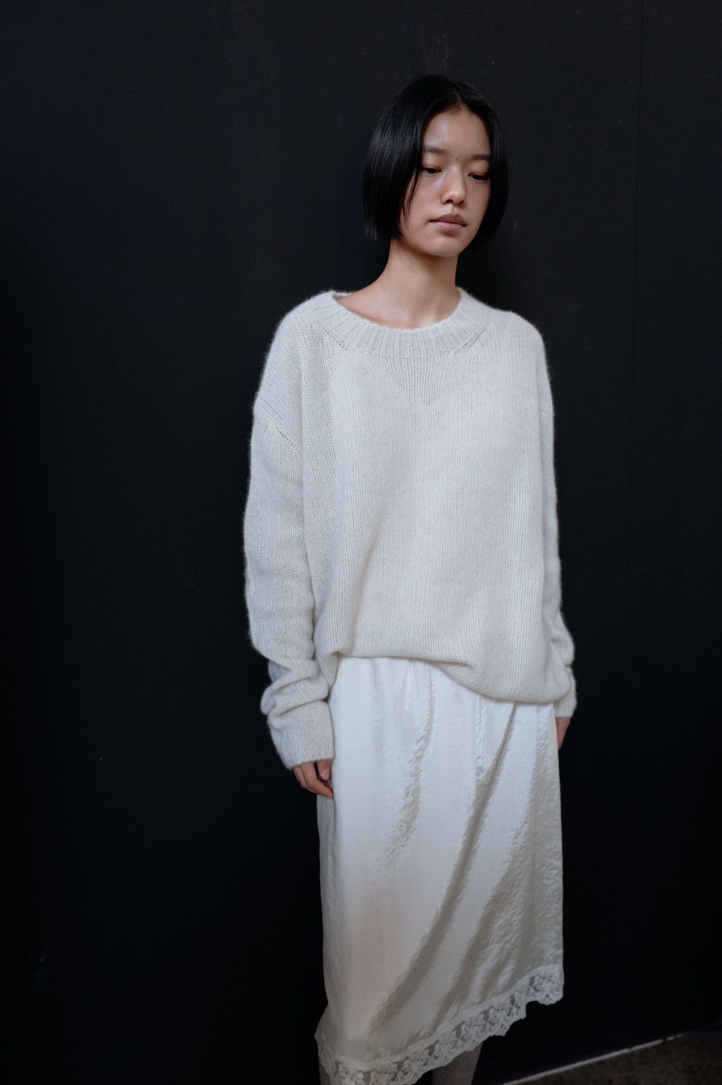 This round-neck knit features the distinctive hairline of luxurious fox fur. Crafted with minimal weight, it's lightweight enough to be worn comfortably like a T-shirt under a thick outerwear garment. The short-sleeved portion is finished with a subtle, low-profile knitting technique. The overall silhouette is relaxed, not clinging to the body, and features dropped sleeves.