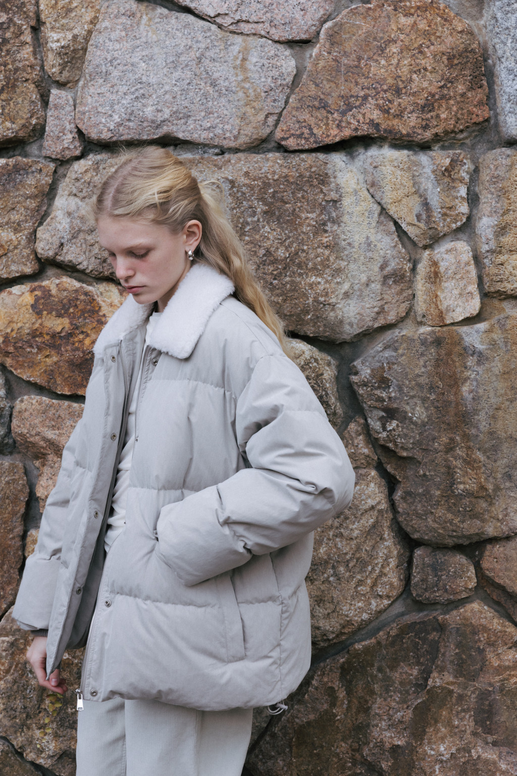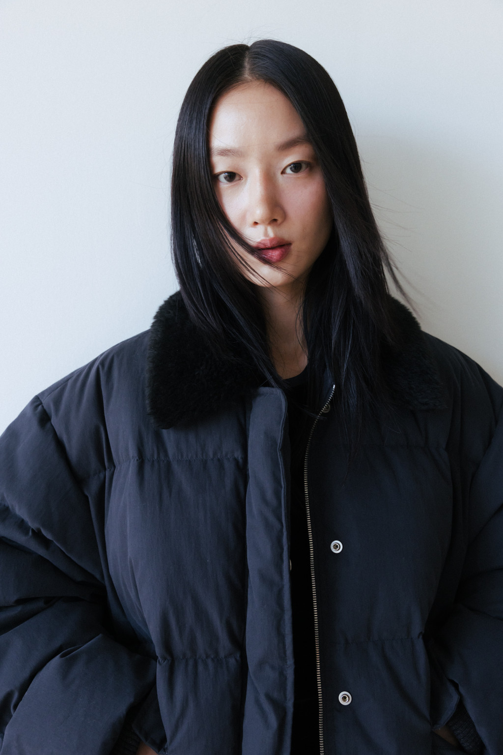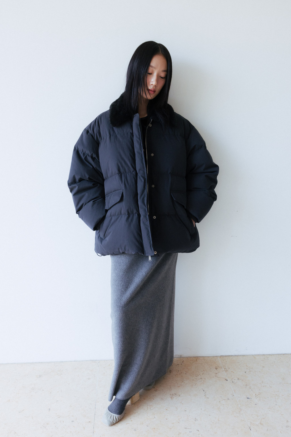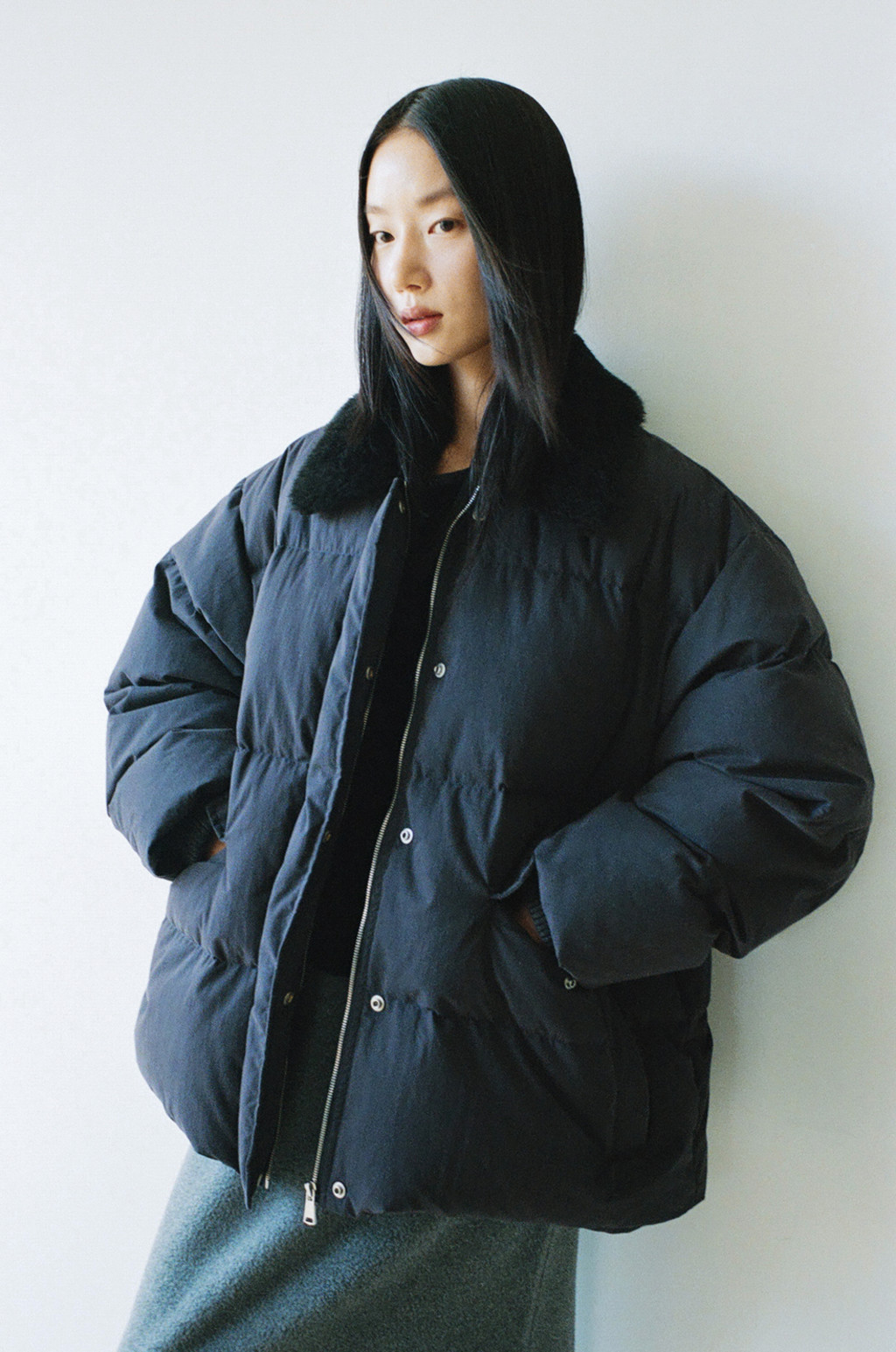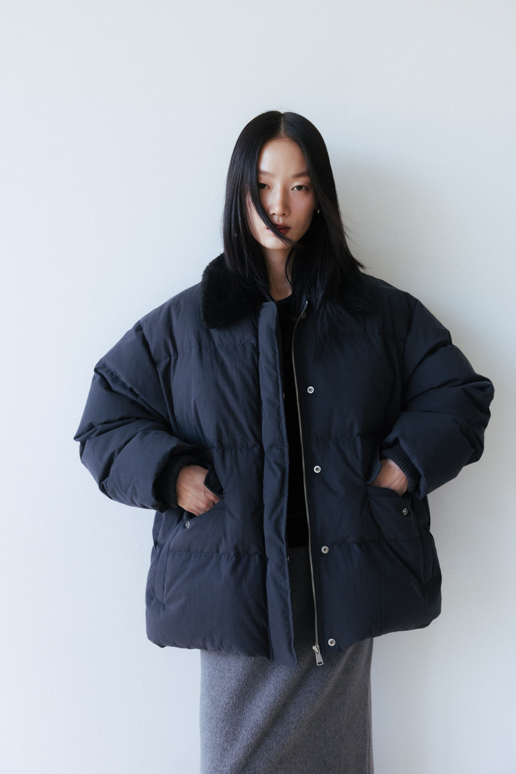 This duck down jumper is crafted from a high-density cotton-nylon blend fabric that provides excellent wind resistance. Filled with high fill-power duck down, it offers exceptional warmth while remaining lightweight. The slightly hip-covering length pairs effortlessly with a variety of bottoms, enhancing both versatility and practicality. An adjustable drawstring at the hem allows you to shape the silhouette as desired, while the collar features a wool-blend faux fur trim that adds both warmth and a touch of luxury. The overall relaxed and voluminous silhouette ensures a comfortable fit, complemented by outer and side pockets that enhance functionality and design detail. Thick inner ribbing at the sleeve openings blocks cold air effectively, and the front closure is finished with a zipper and hidden snaps for a clean, refined look.