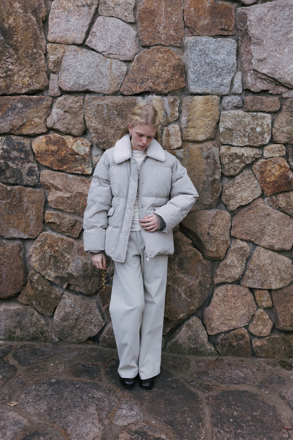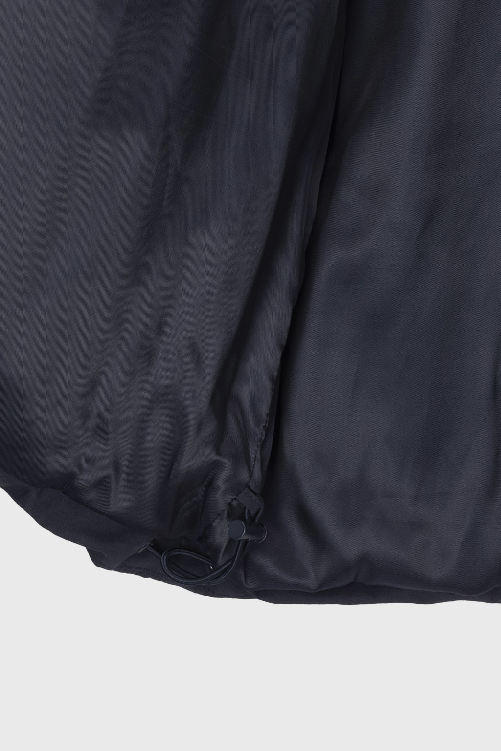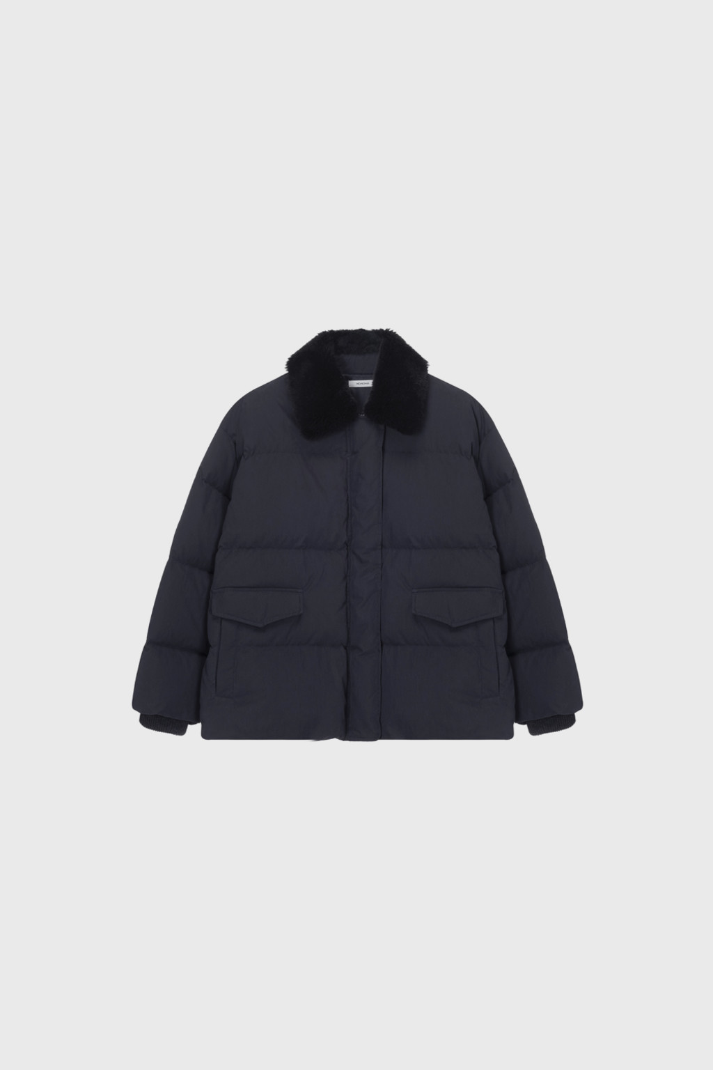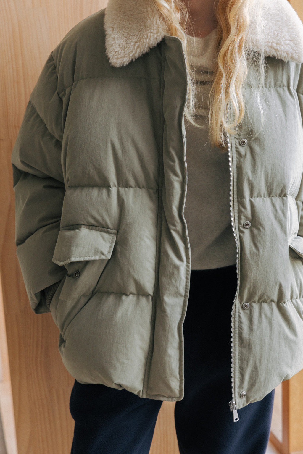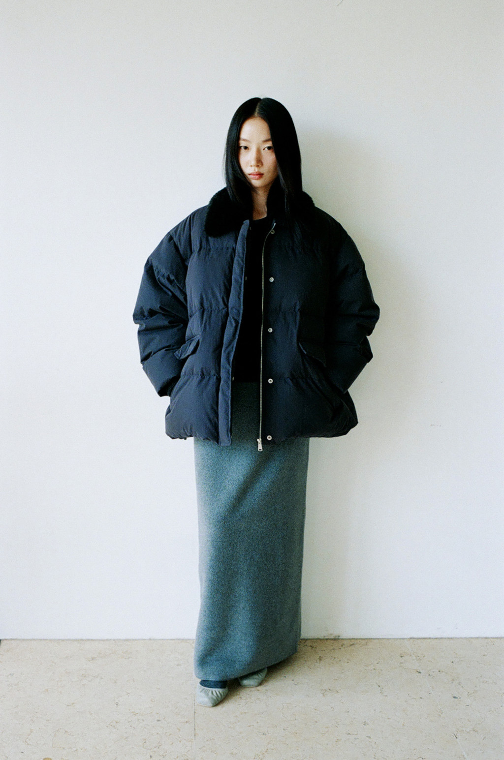 This duck down jumper is crafted from a high-density cotton-nylon blend fabric that provides excellent wind resistance. Filled with high fill-power duck down, it offers exceptional warmth while remaining lightweight. The slightly hip-covering length pairs effortlessly with a variety of bottoms, enhancing both versatility and practicality. An adjustable drawstring at the hem allows you to shape the silhouette as desired, while the collar features a wool-blend faux fur trim that adds both warmth and a touch of luxury. The overall relaxed and voluminous silhouette ensures a comfortable fit, complemented by outer and side pockets that enhance functionality and design detail. Thick inner ribbing at the sleeve openings blocks cold air effectively, and the front closure is finished with a zipper and hidden snaps for a clean, refined look.