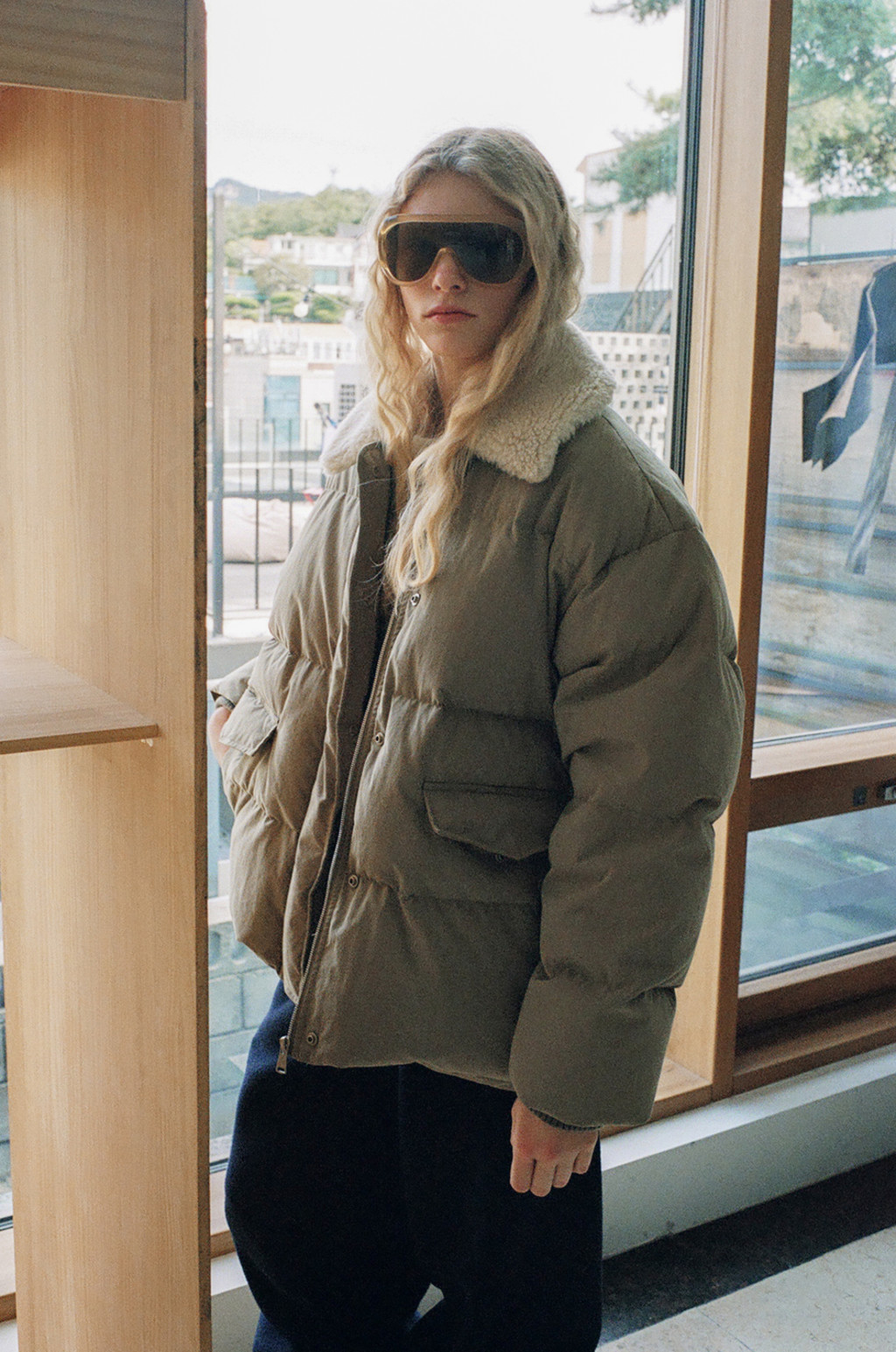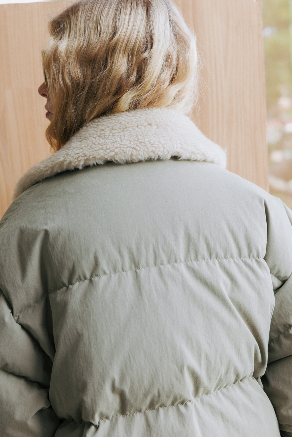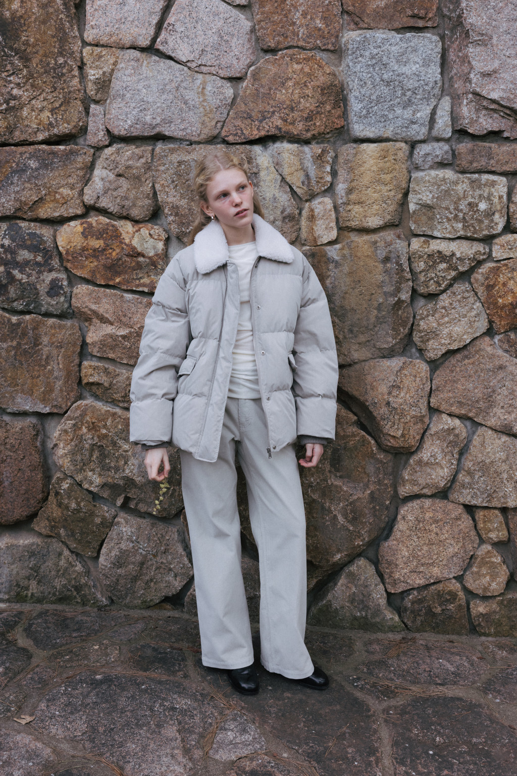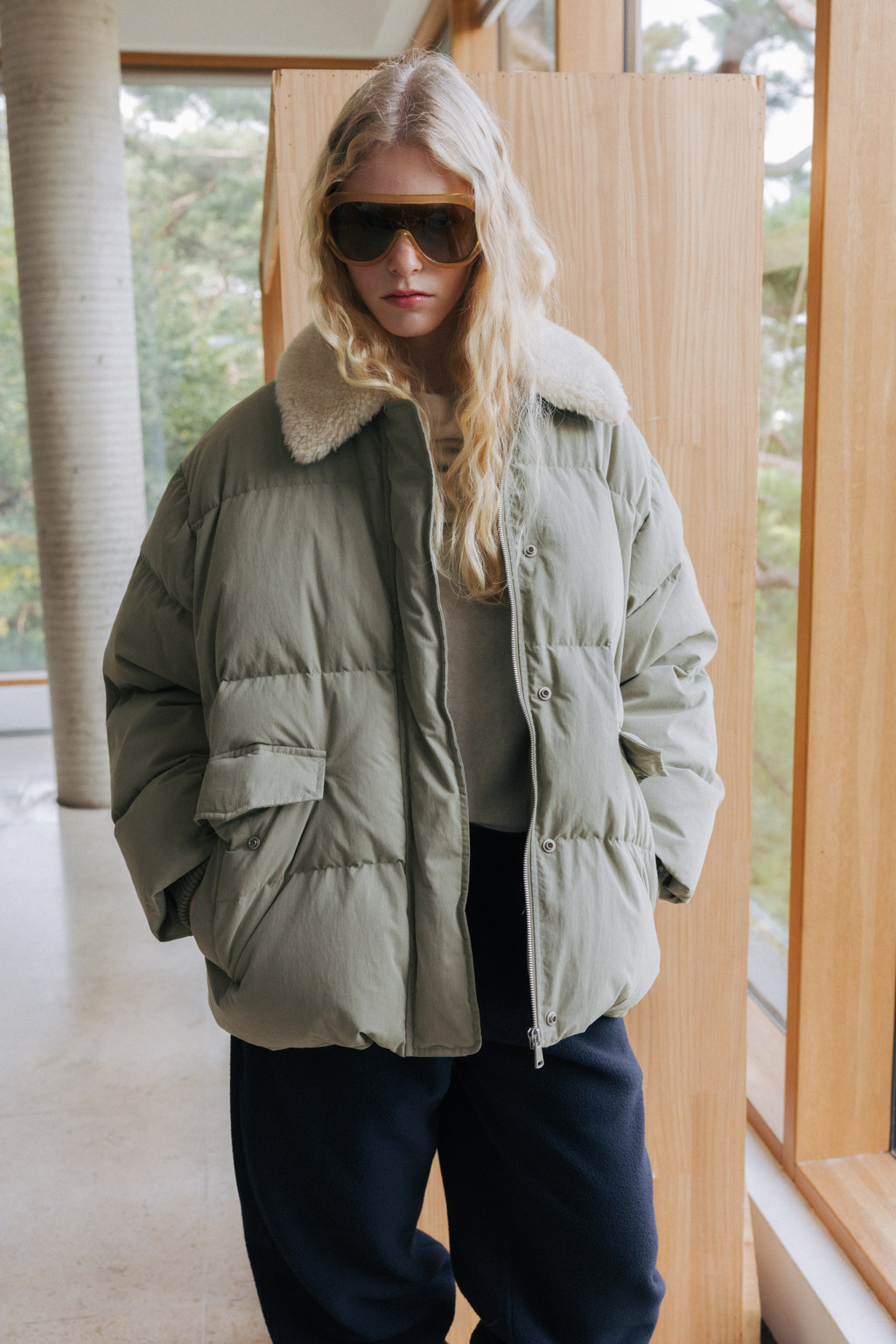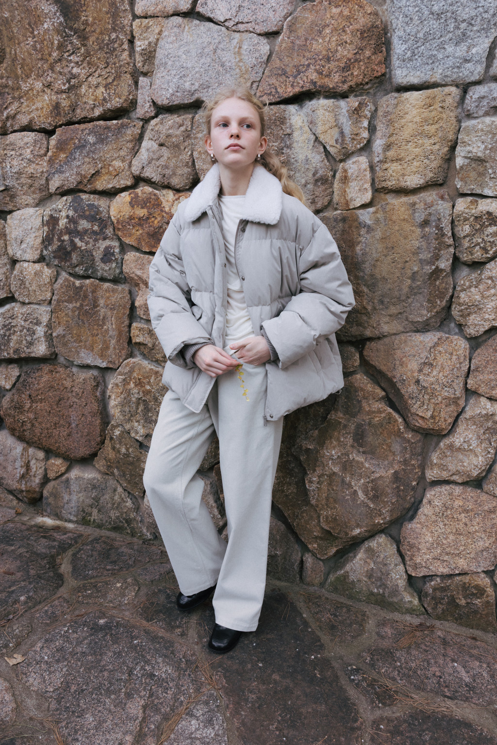 This duck down jumper is crafted from a high-density cotton-nylon blend fabric that provides excellent wind resistance. Filled with high fill-power duck down, it offers exceptional warmth while remaining lightweight. The slightly hip-covering length pairs effortlessly with a variety of bottoms, enhancing both versatility and practicality. An adjustable drawstring at the hem allows you to shape the silhouette as desired, while the collar features a wool-blend faux fur trim that adds both warmth and a touch of luxury. The overall relaxed and voluminous silhouette ensures a comfortable fit, complemented by outer and side pockets that enhance functionality and design detail. Thick inner ribbing at the sleeve openings blocks cold air effectively, and the front closure is finished with a zipper and hidden snaps for a clean, refined look.