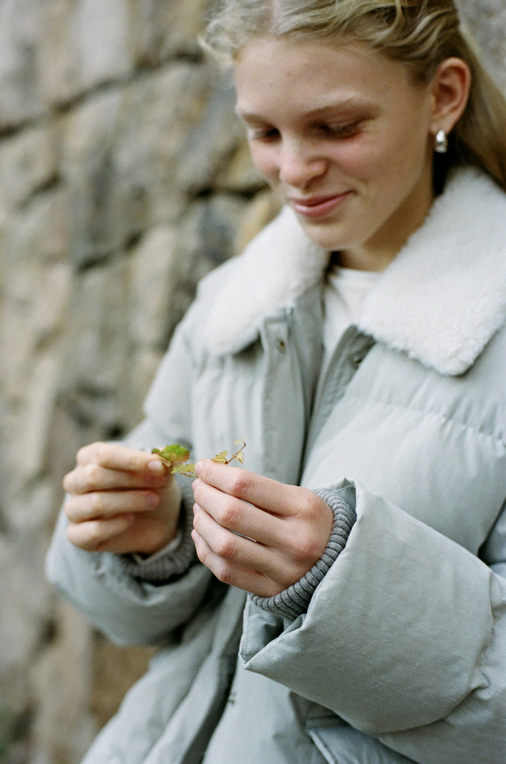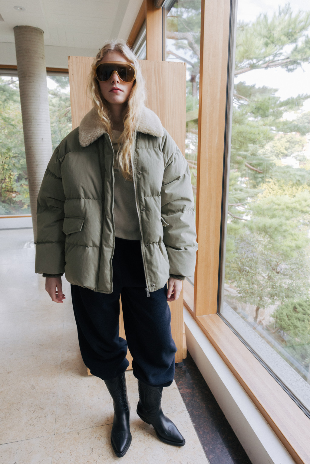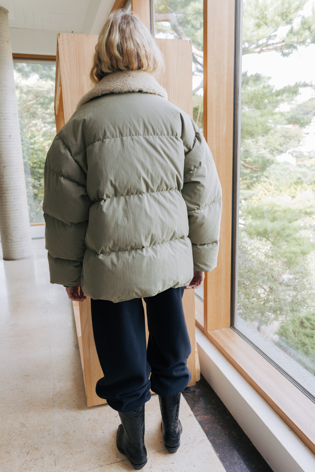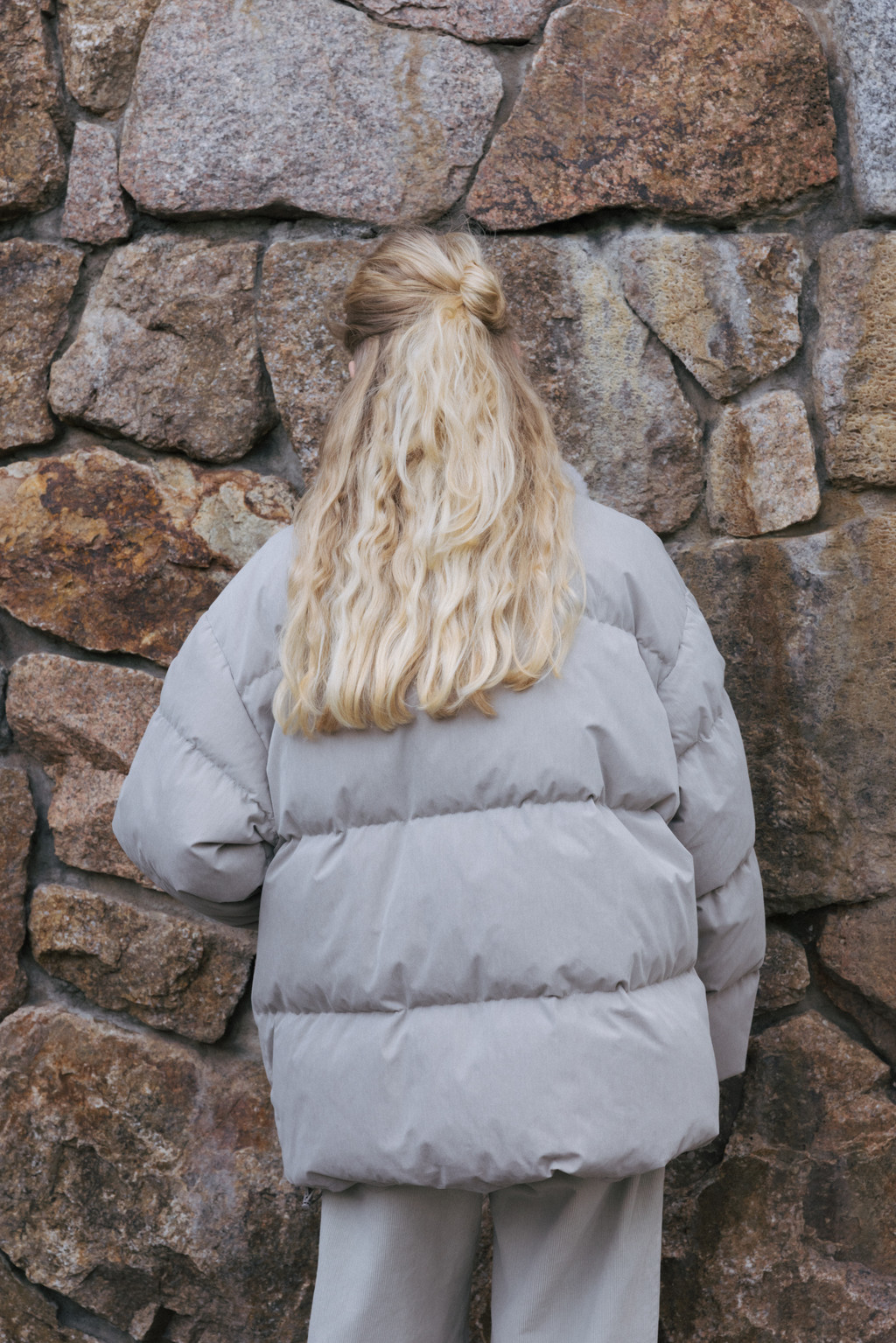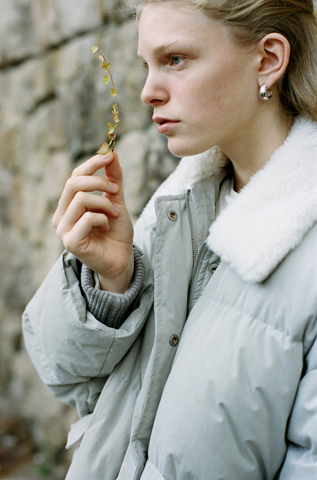 This duck down jumper is crafted from a high-density cotton-nylon blend fabric that provides excellent wind resistance. Filled with high fill-power duck down, it offers exceptional warmth while remaining lightweight. The slightly hip-covering length pairs effortlessly with a variety of bottoms, enhancing both versatility and practicality. An adjustable drawstring at the hem allows you to shape the silhouette as desired, while the collar features a wool-blend faux fur trim that adds both warmth and a touch of luxury. The overall relaxed and voluminous silhouette ensures a comfortable fit, complemented by outer and side pockets that enhance functionality and design detail. Thick inner ribbing at the sleeve openings blocks cold air effectively, and the front closure is finished with a zipper and hidden snaps for a clean, refined look.