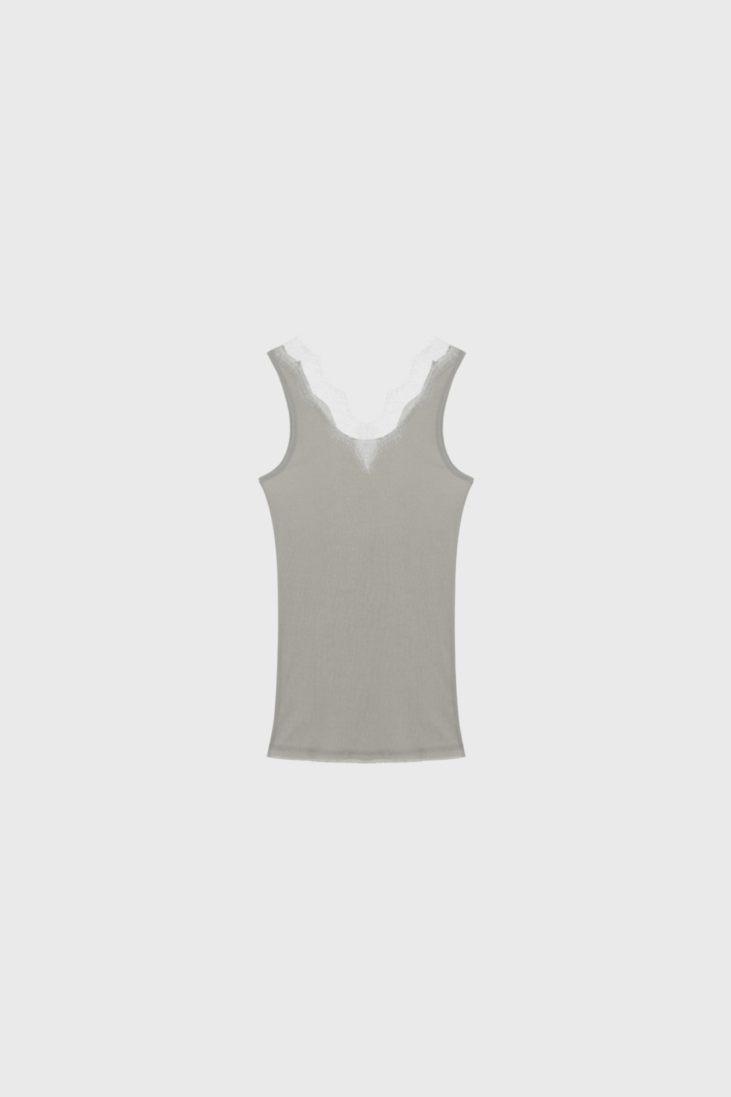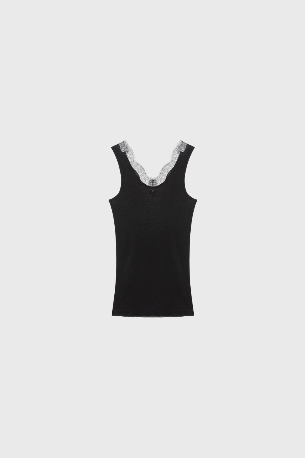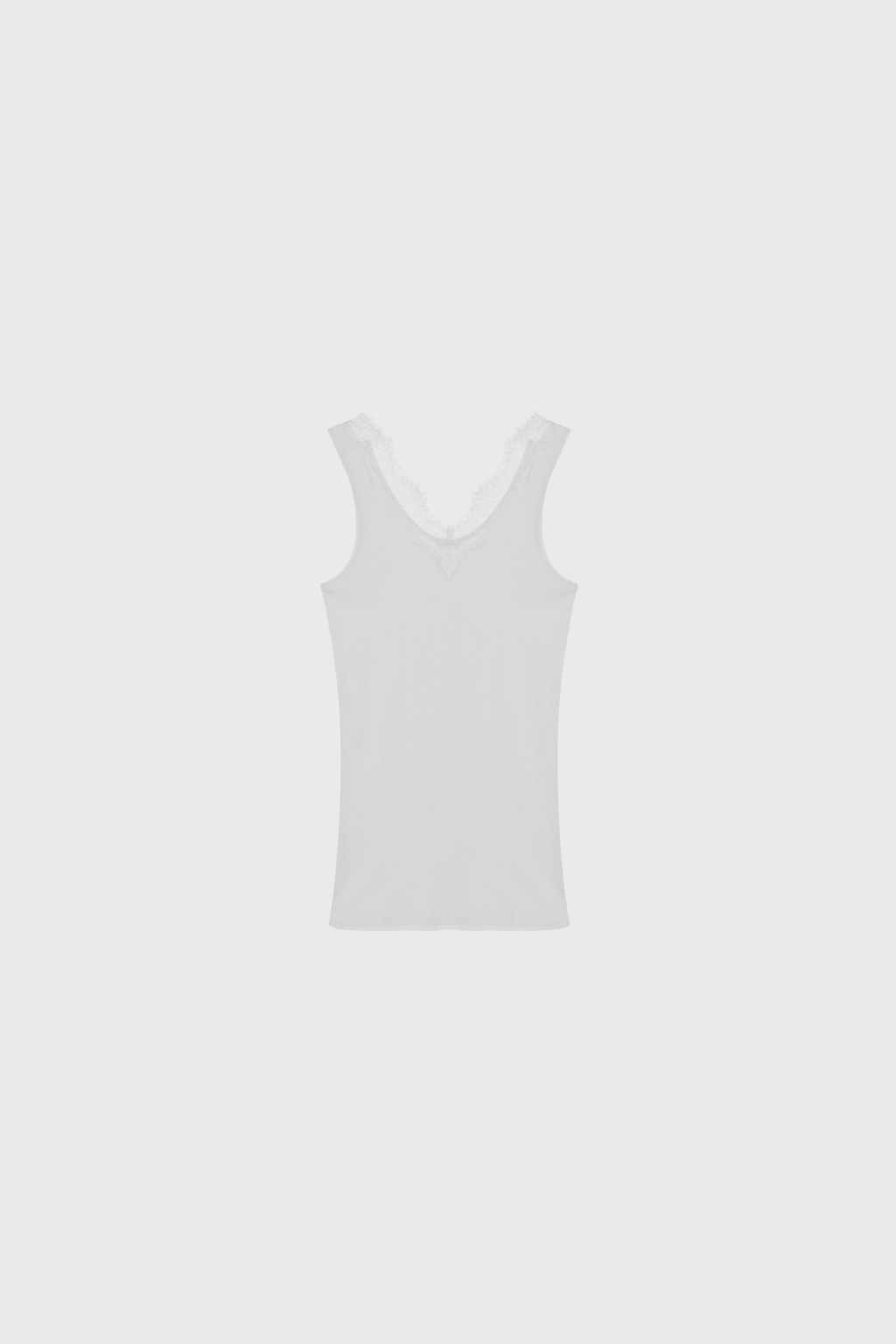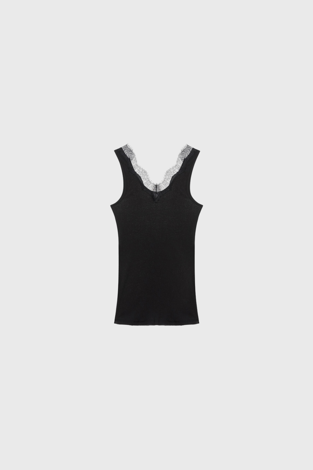 This sleeveless top is made from a thin, stretchy ribbed jersey fabric that gently hugs the body for a comfortable fit. Delicate floral lace trimming along the V-neckline adds a refined, lingerie-inspired touch. It’s an innerwear-style piece that’s perfect for light layering under shirts or jackets.