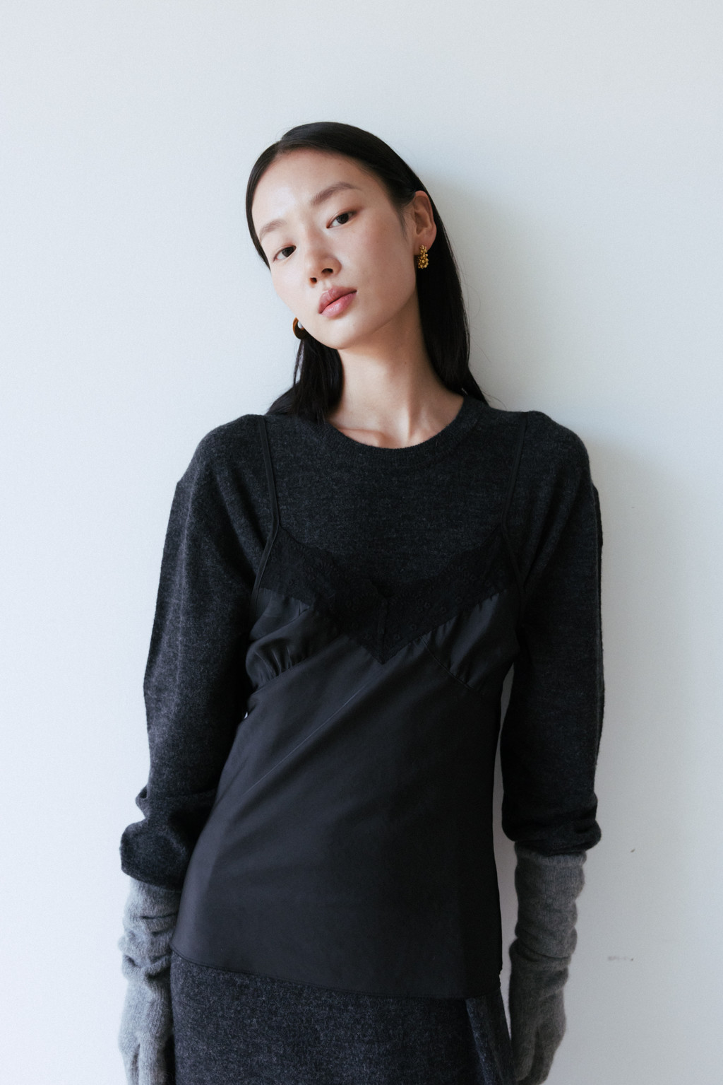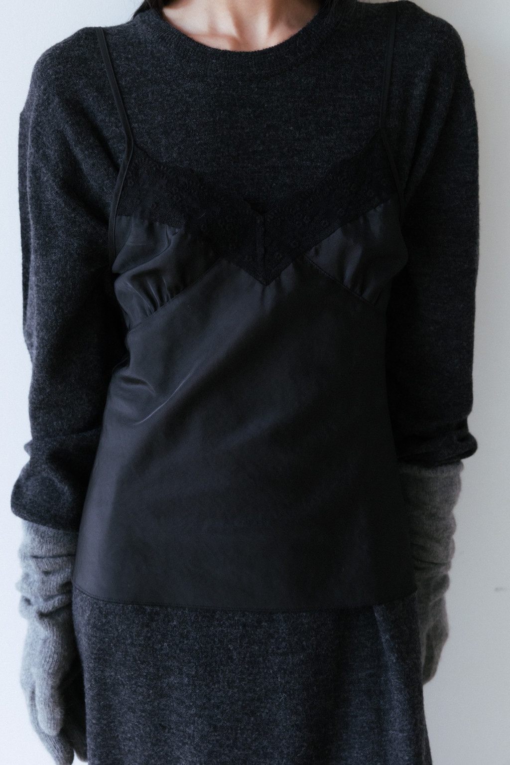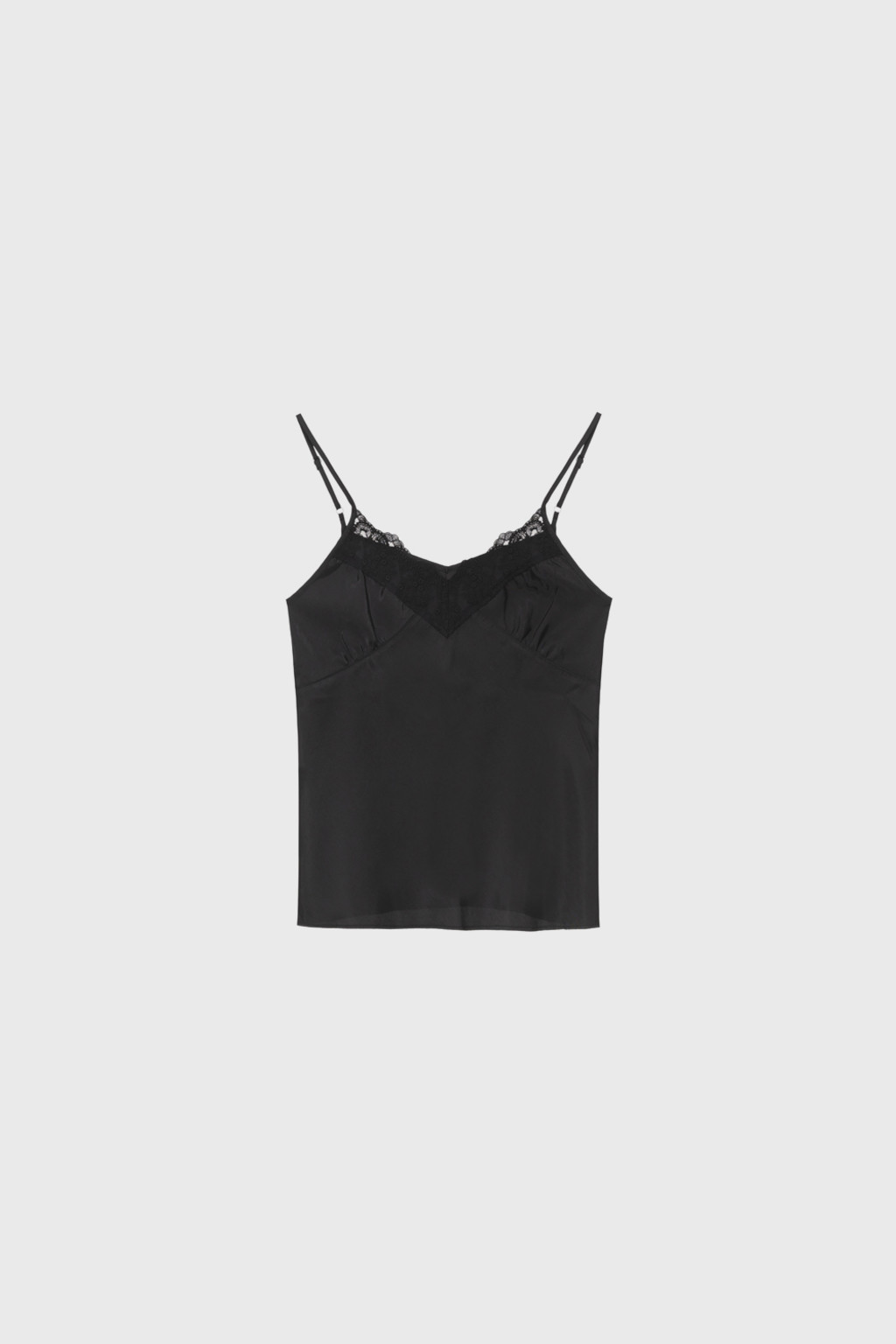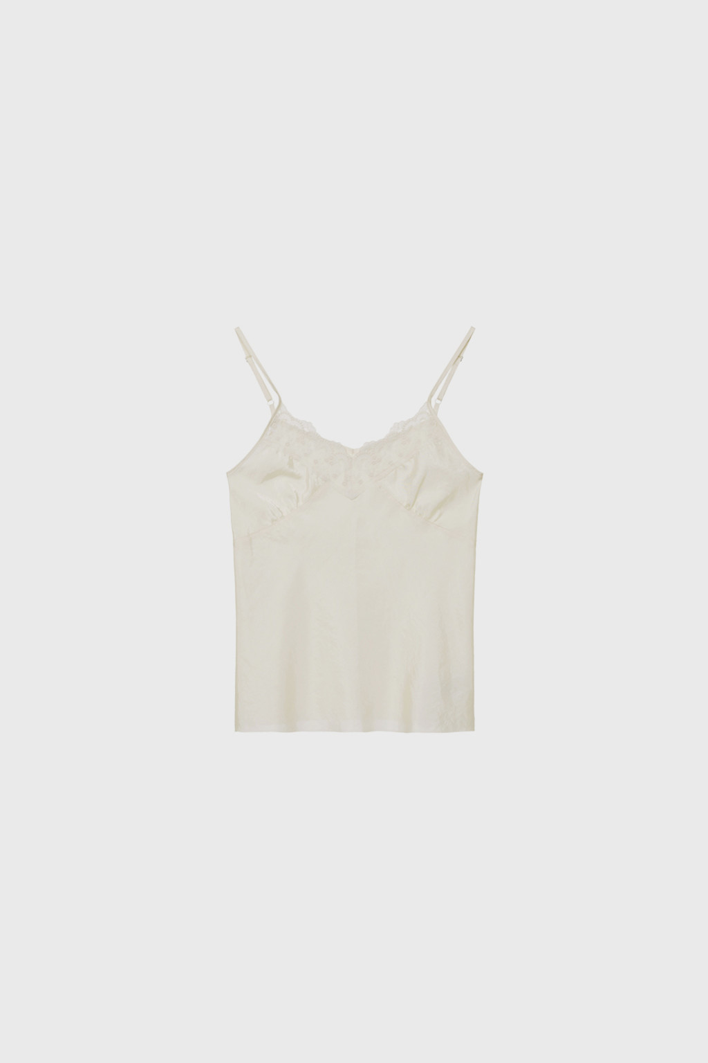 This slip top is crafted from a silky fabric with a subtle sheen. Its softly flowing texture is a standout feature, and the fabric is thick enough to prevent transparency, making it easy to wear on its own without worry. The straps are finished with drawstring details, allowing for adjustable length. The hem is raw-cut and stitched, creating a natural, relaxed finish. It’s a versatile piece, perfect for layering under shirts or outerwear for a simple yet stylish look.
