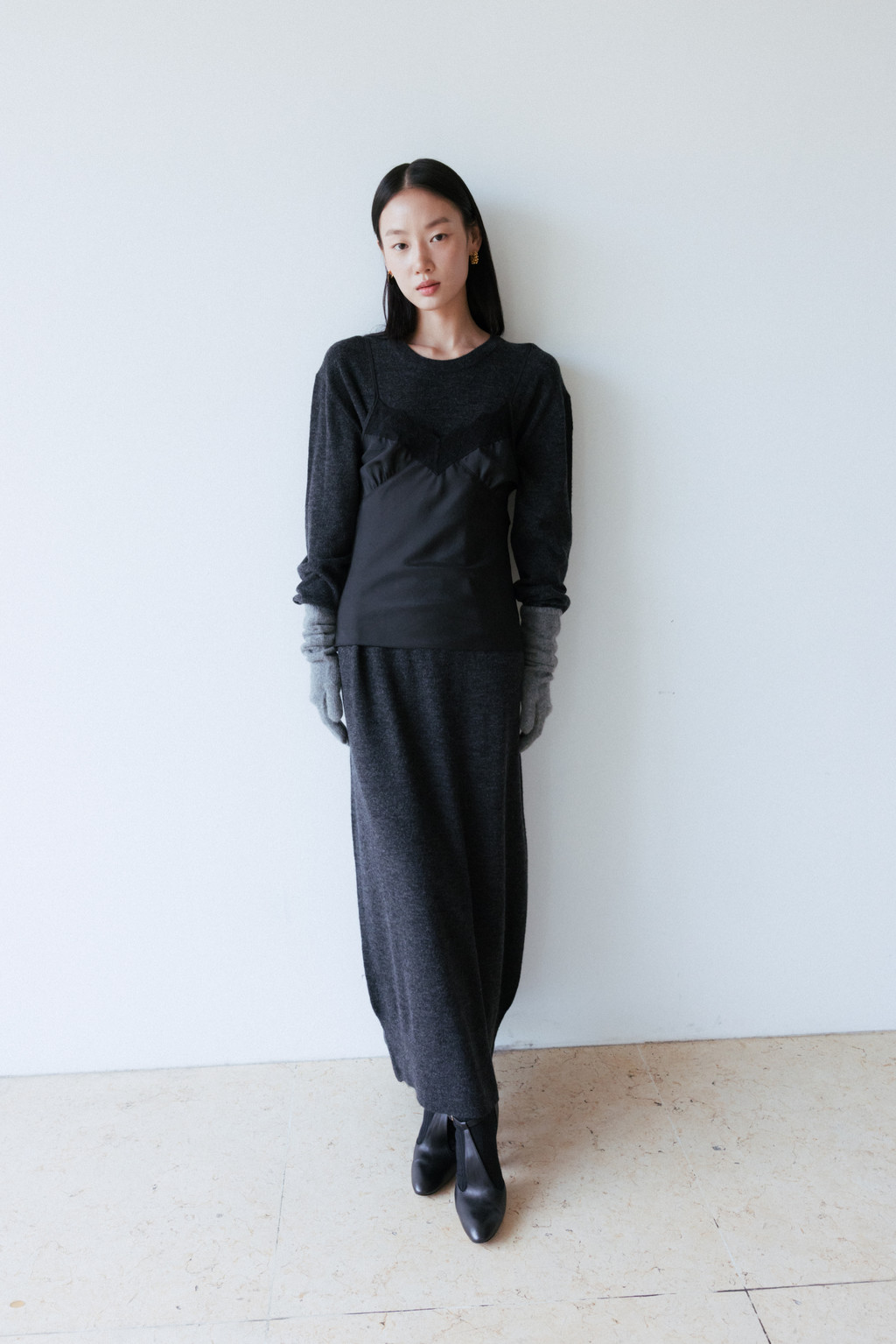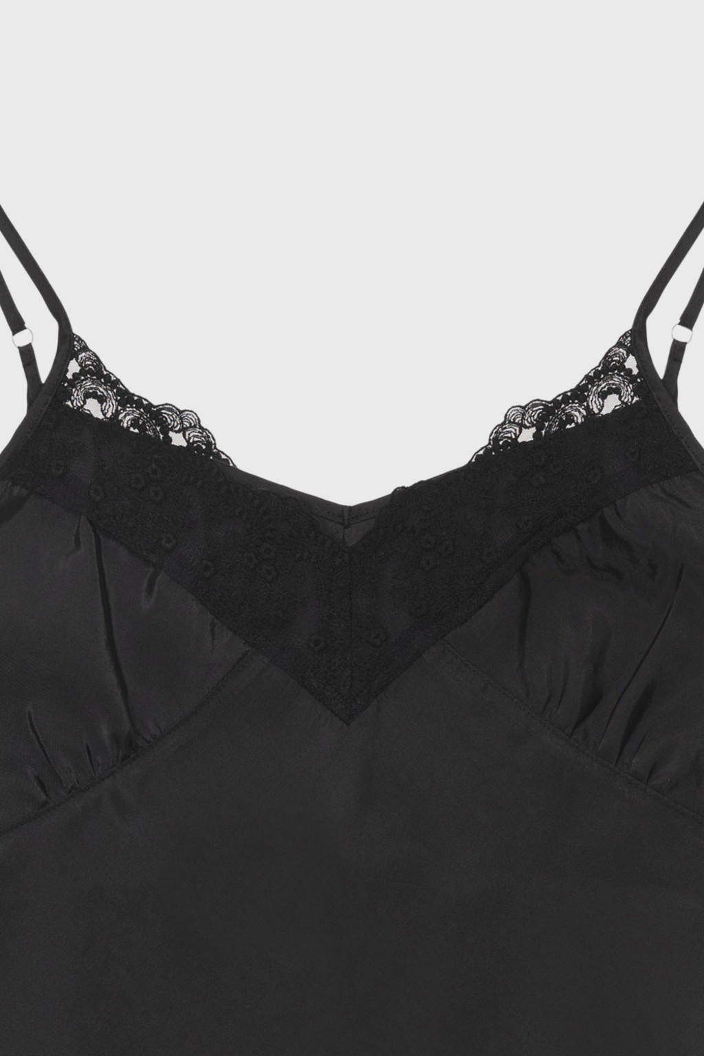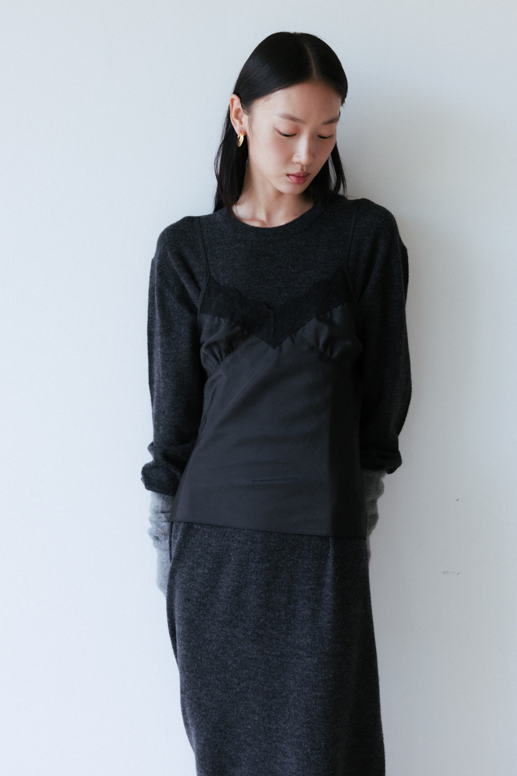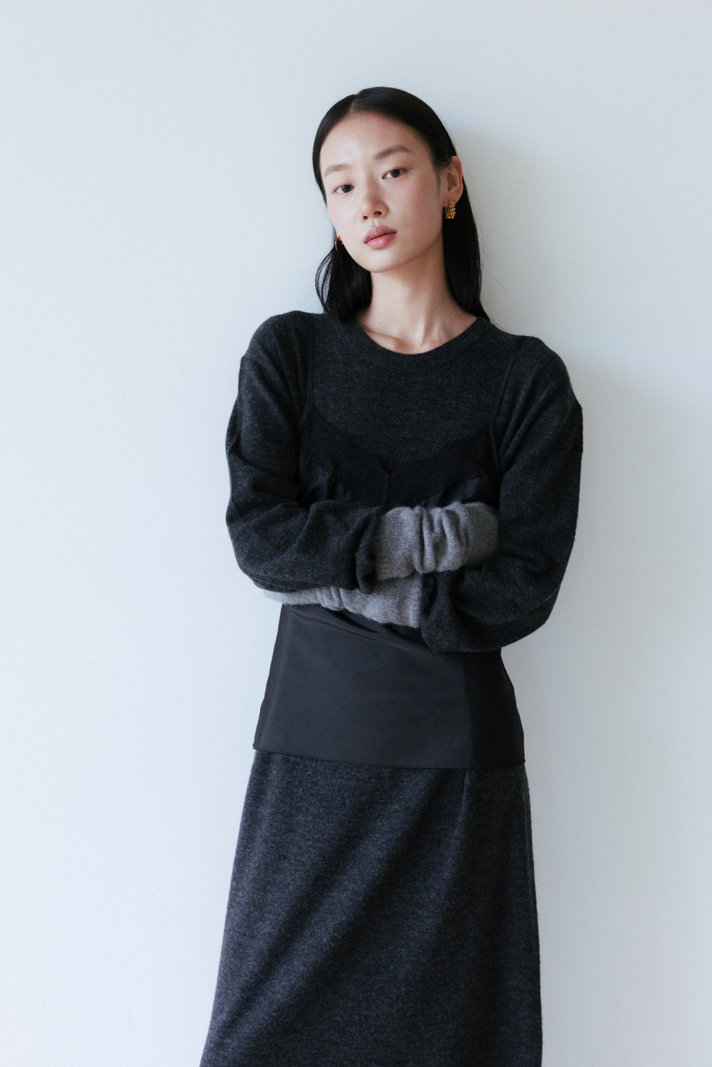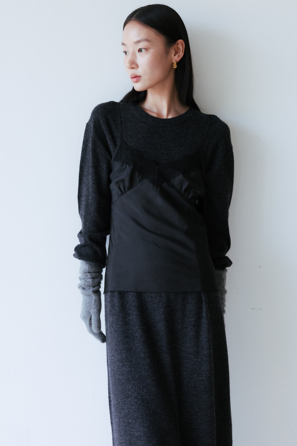 This slip top is crafted from a silky fabric with a subtle sheen. Its softly flowing texture is a standout feature, and the fabric is thick enough to prevent transparency, making it easy to wear on its own without worry. The straps are finished with drawstring details, allowing for adjustable length. The hem is raw-cut and stitched, creating a natural, relaxed finish. It’s a versatile piece, perfect for layering under shirts or outerwear for a simple yet stylish look.