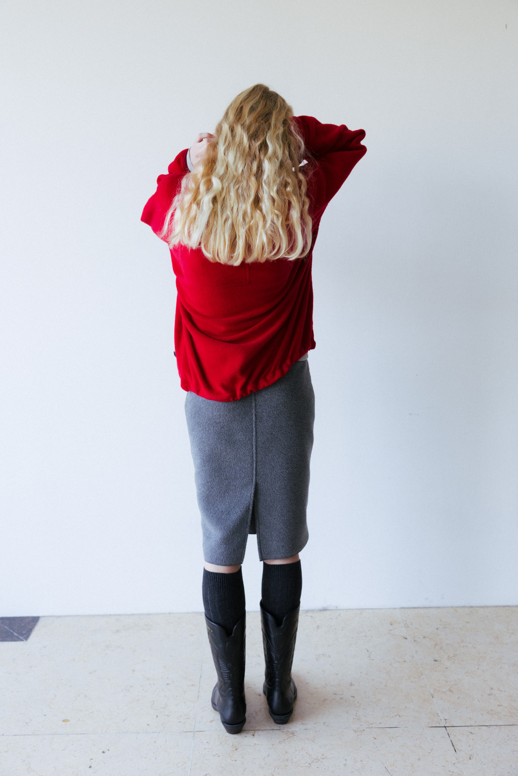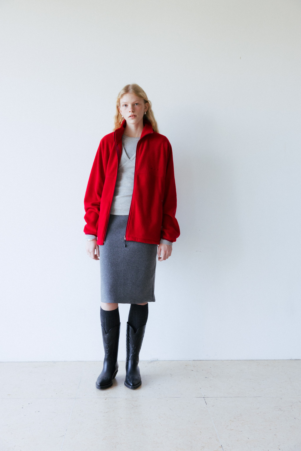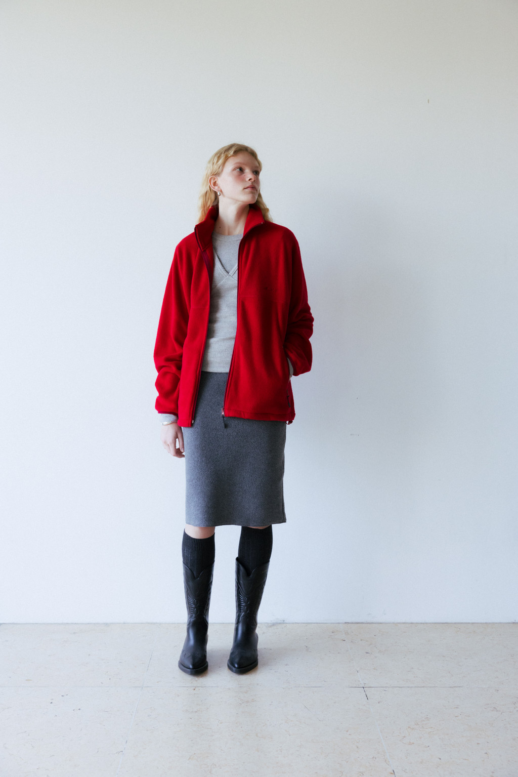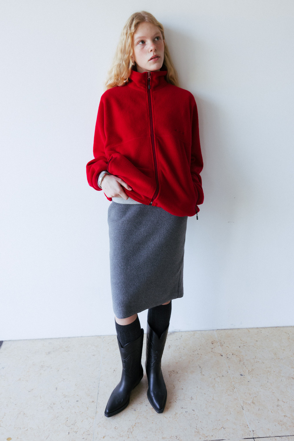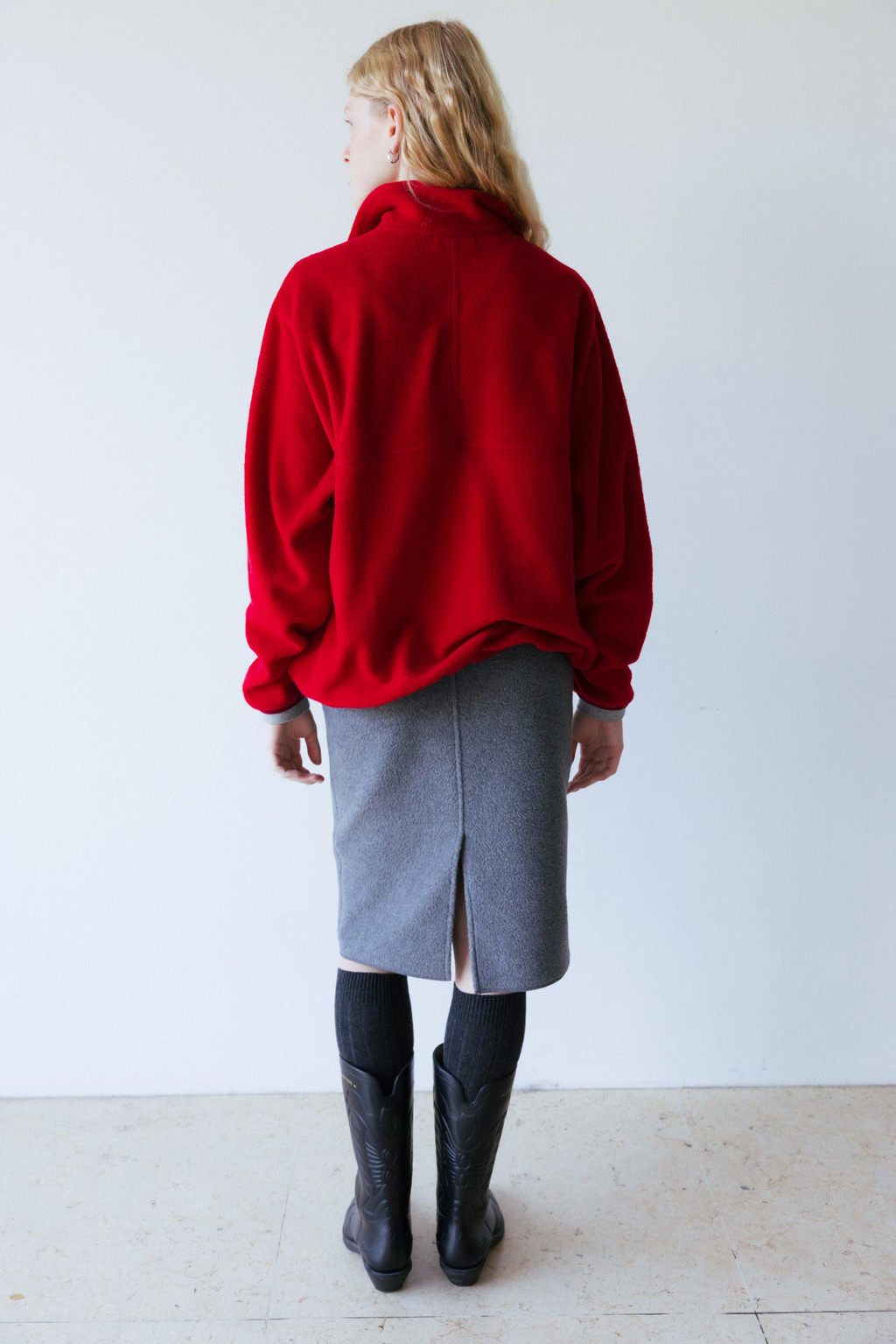 This midi skirt is made of fleece, a versatile material perfect for cold days. Fleece holds a lot of air, making it lightweight and warm. It's also much lighter than wool, making it comfortable to wear. It's durable, abrasion-resistant, and easy to wash. The waistband is elasticated for a more casual look. The waist and hips are comfortably fitted, with an A-line silhouette, and the back slit allows for comfortable movement.
