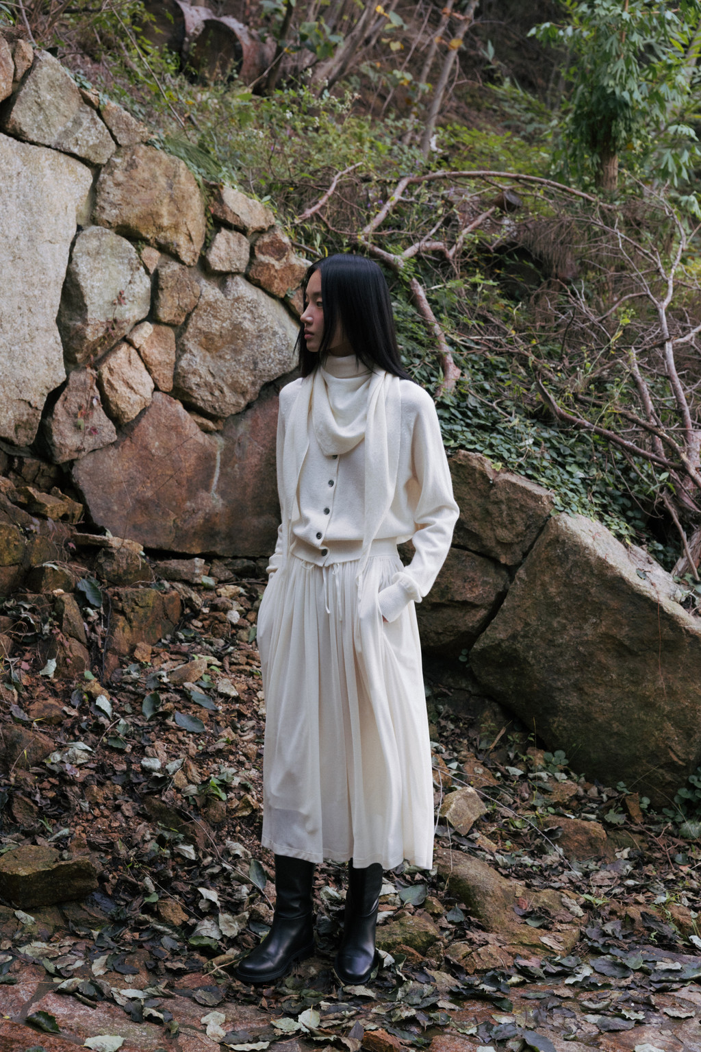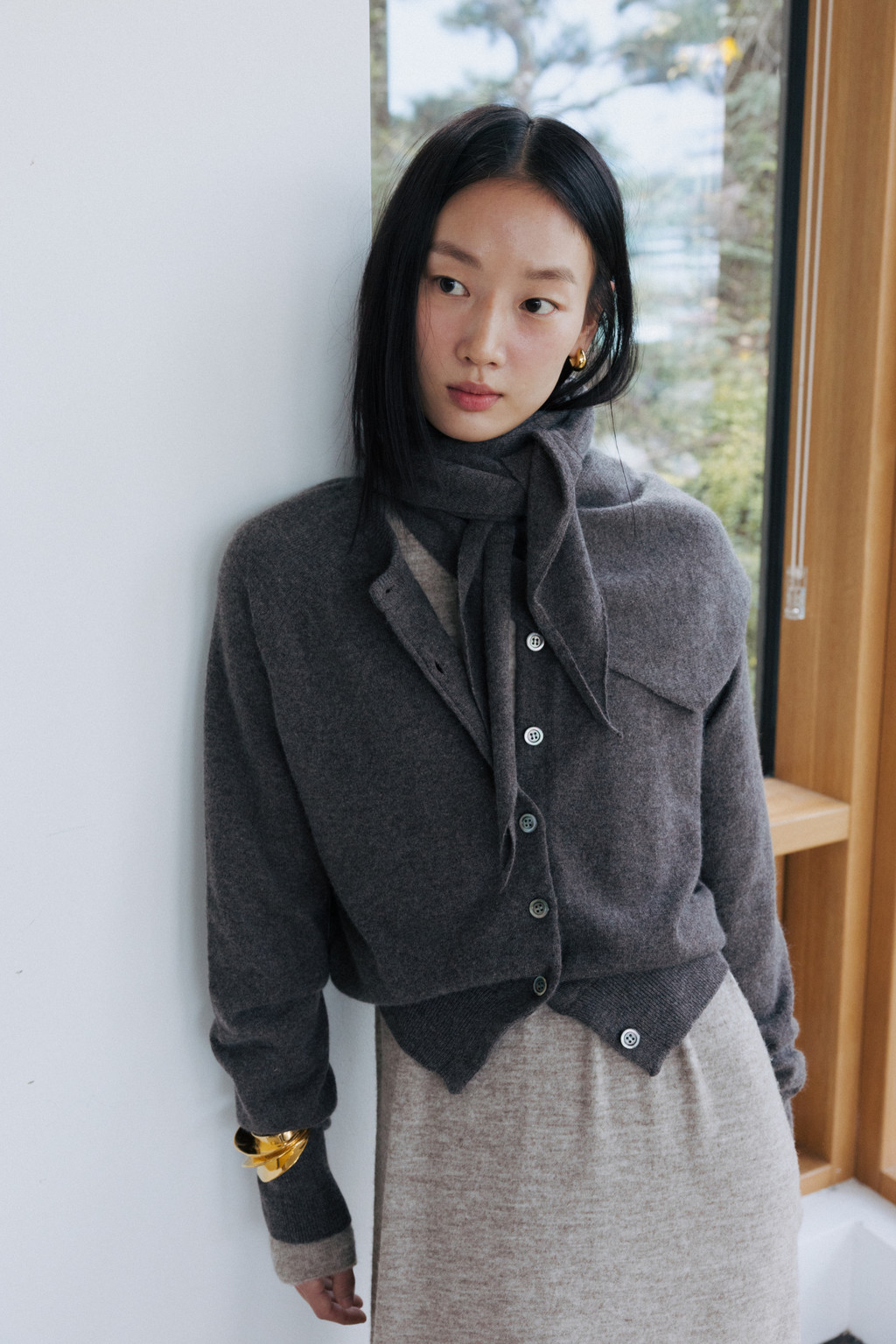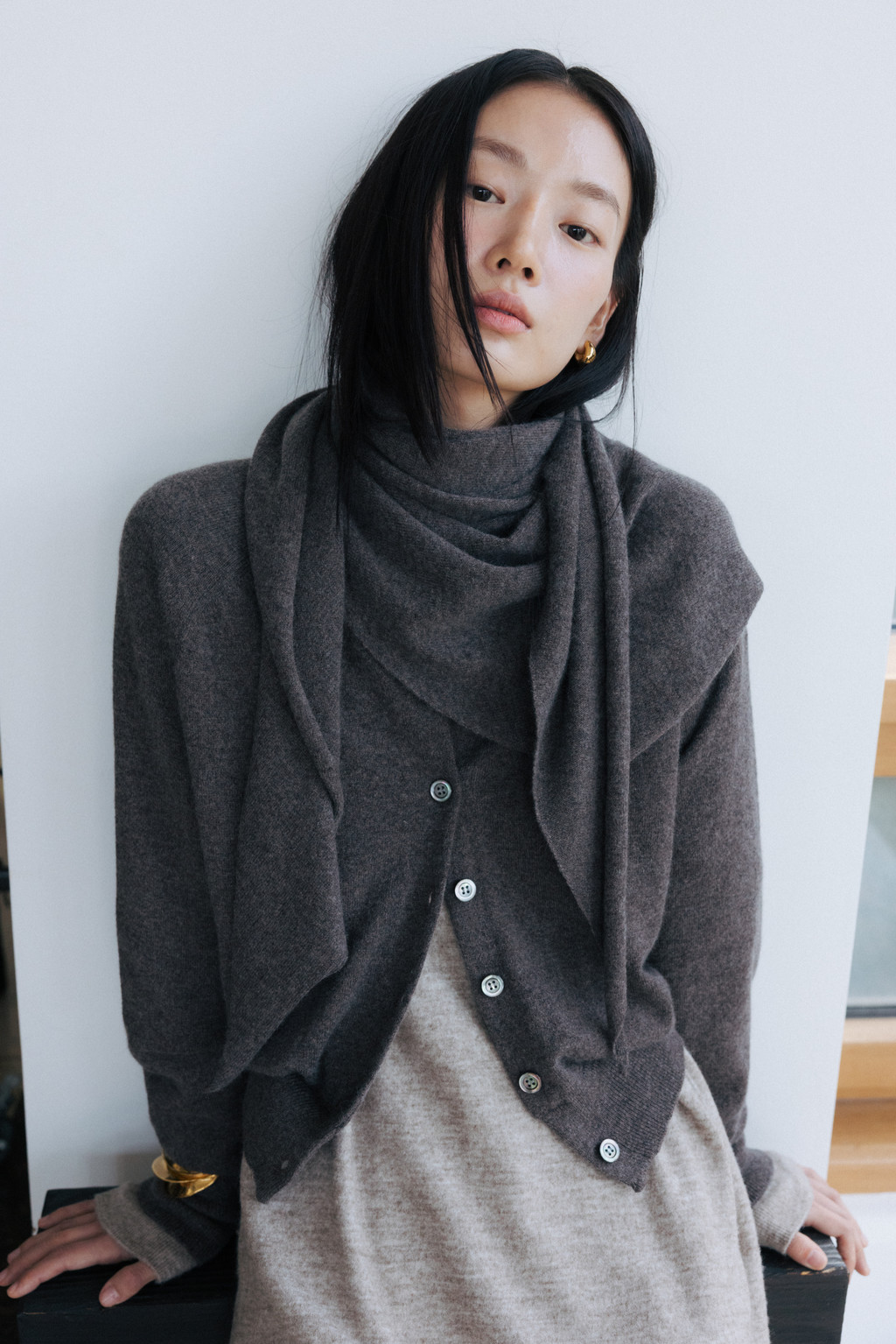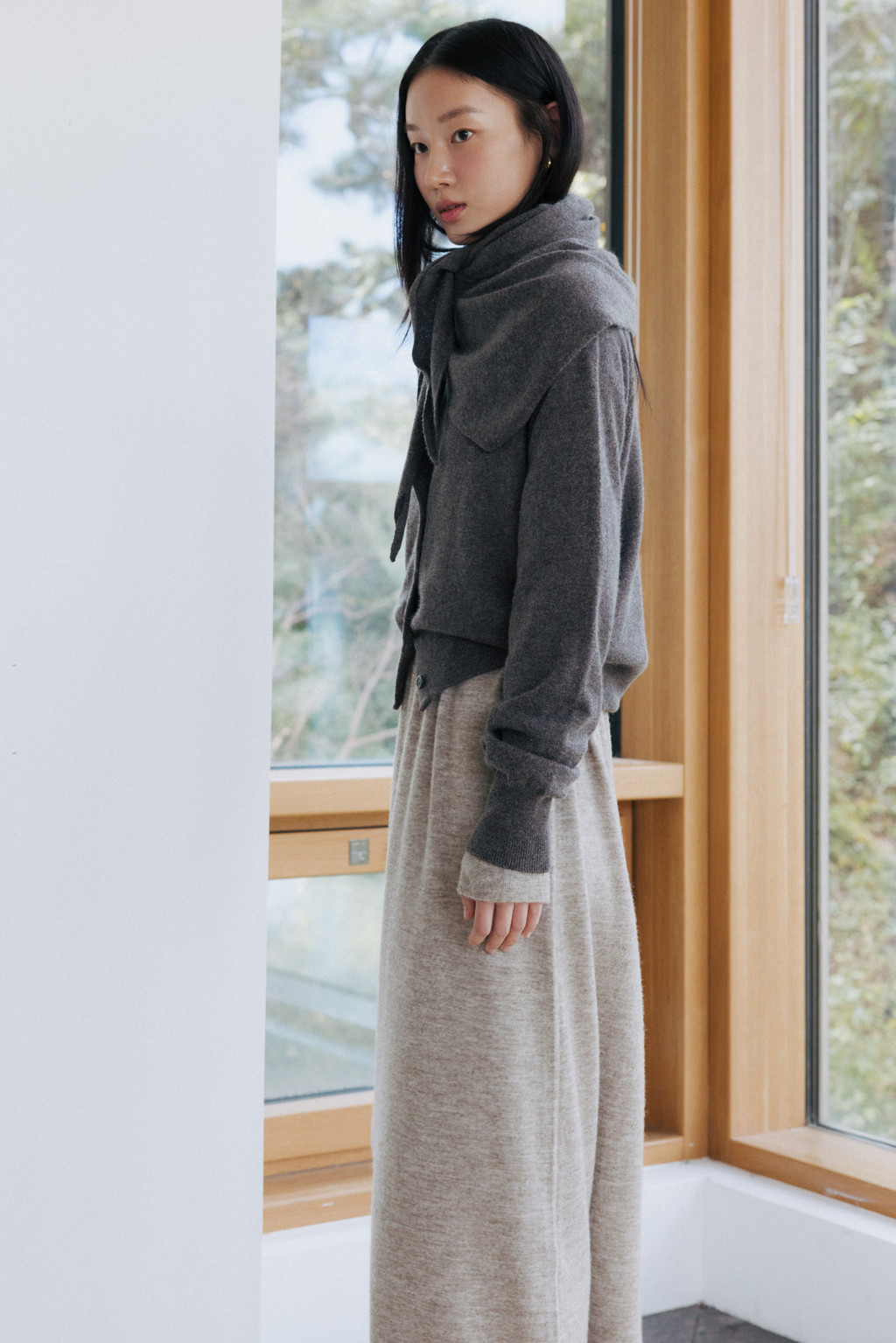 This triangular scarf is crafted from a soft cashmere blend. It boasts the signature lightness and warmth of cashmere, and its moderate thickness ensures warmth even in the dead of winter. Simply draped over the scarf creates a statement piece, making it a versatile piece to pair with a variety of outerwear.