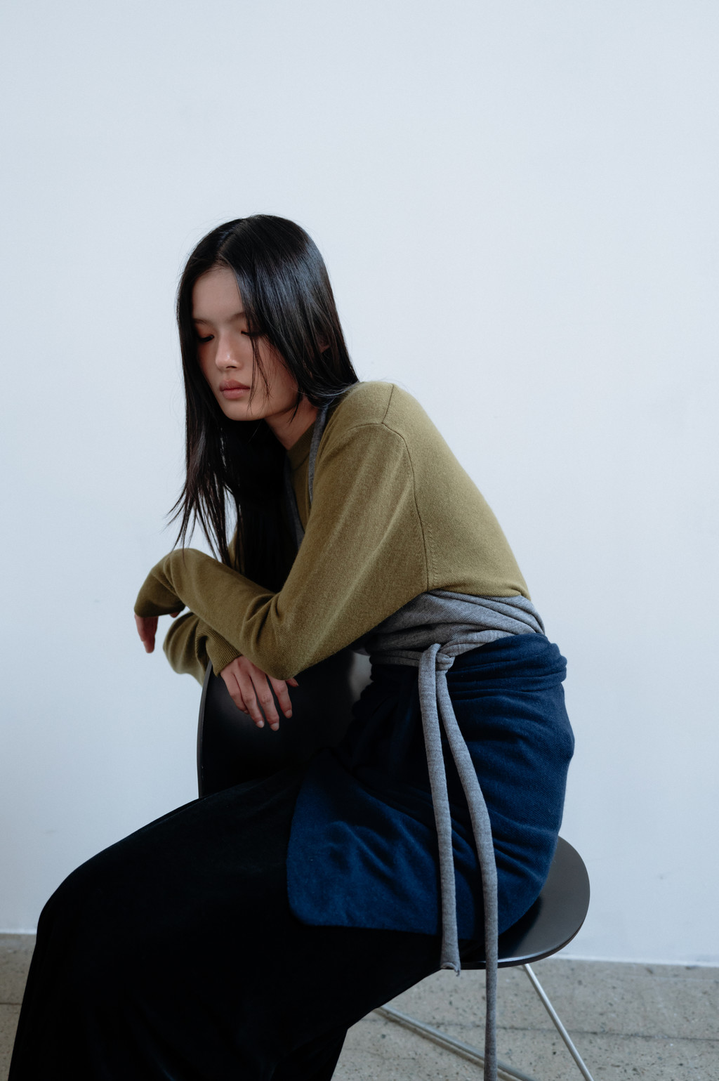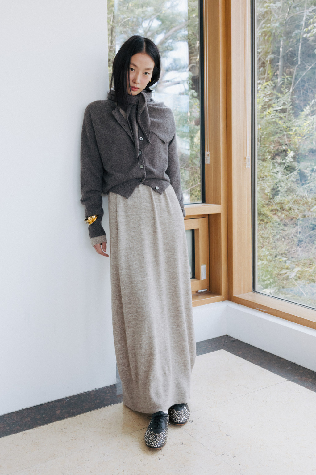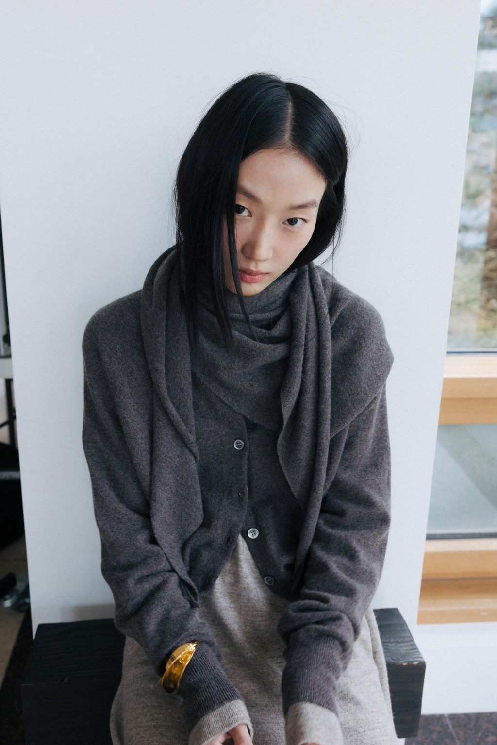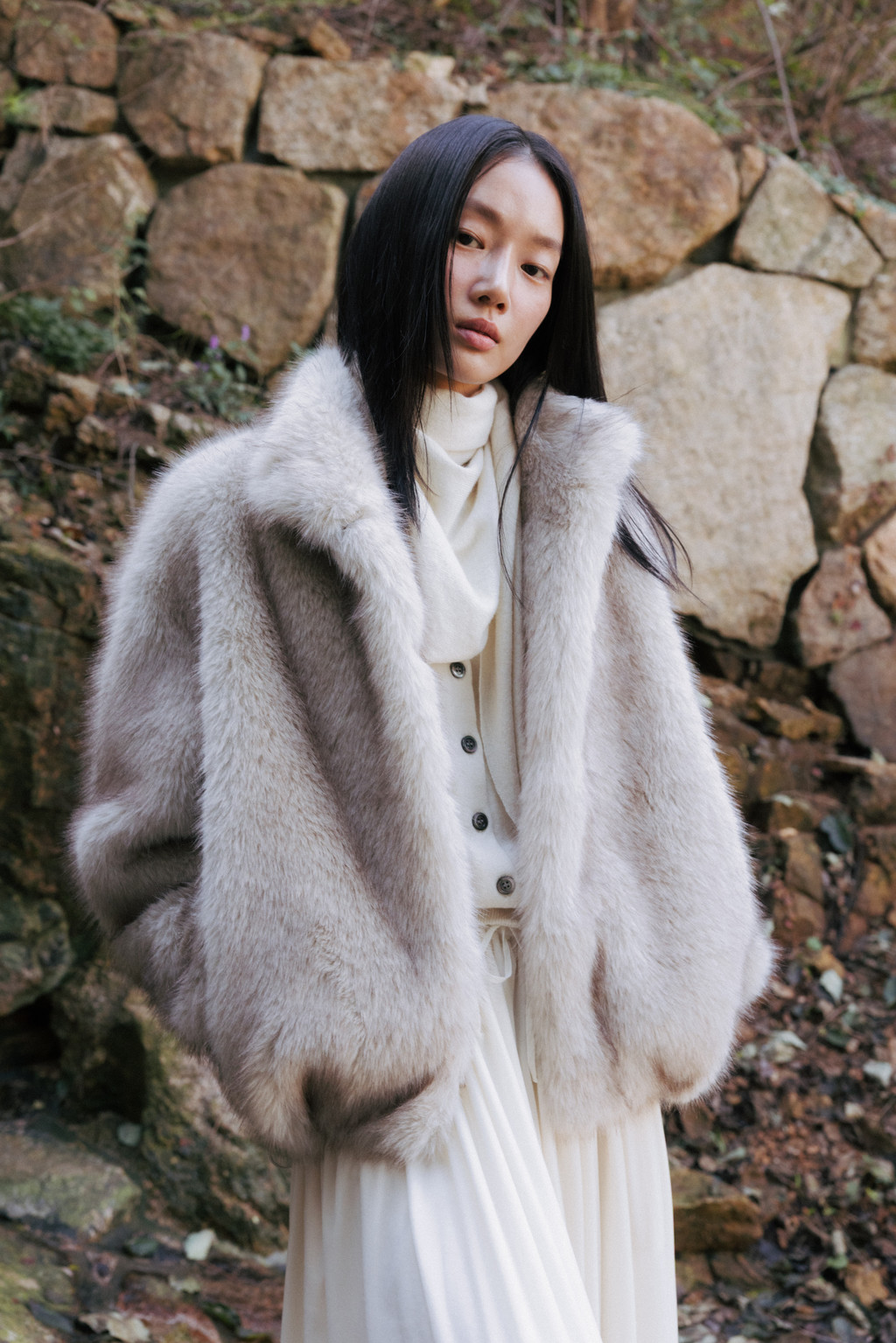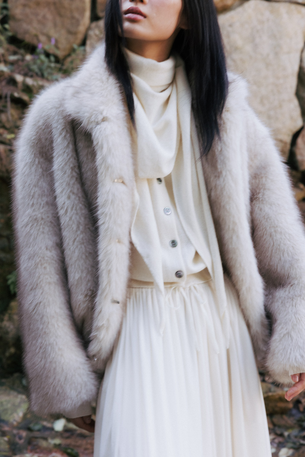 This triangular scarf is crafted from a soft cashmere blend. It boasts the signature lightness and warmth of cashmere, and its moderate thickness ensures warmth even in the dead of winter. Simply draped over the scarf creates a statement piece, making it a versatile piece to pair with a variety of outerwear.