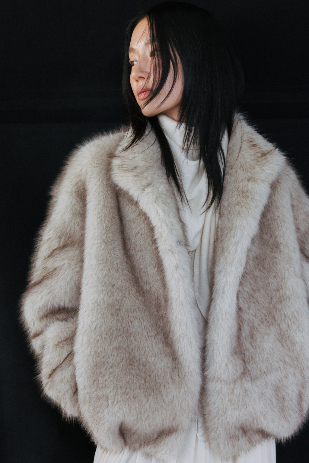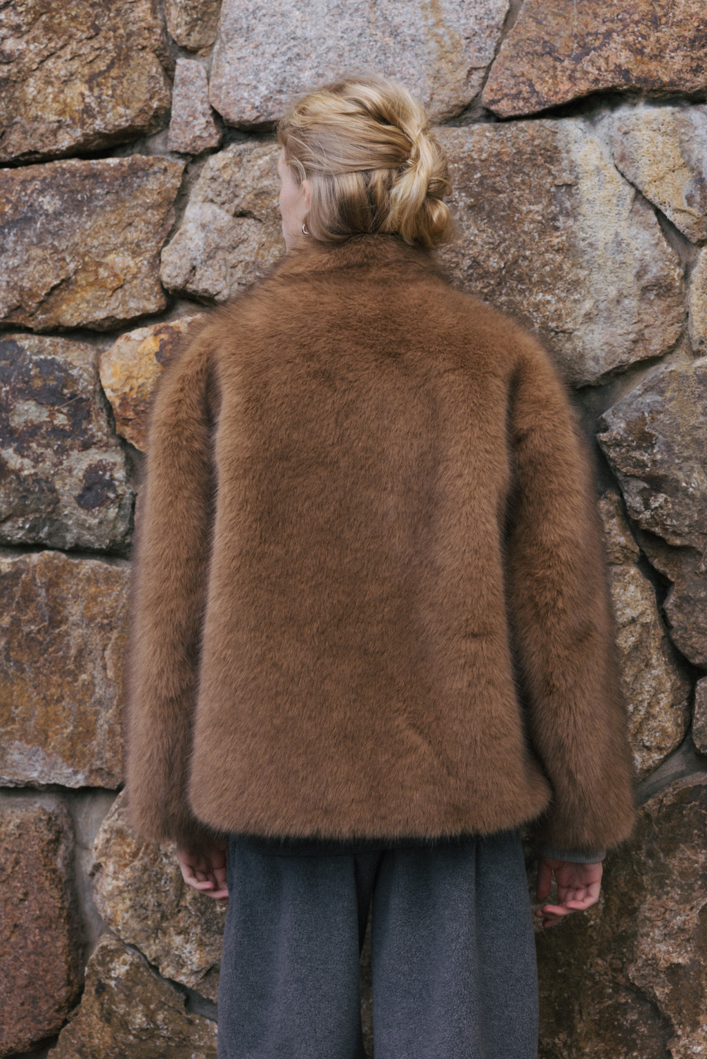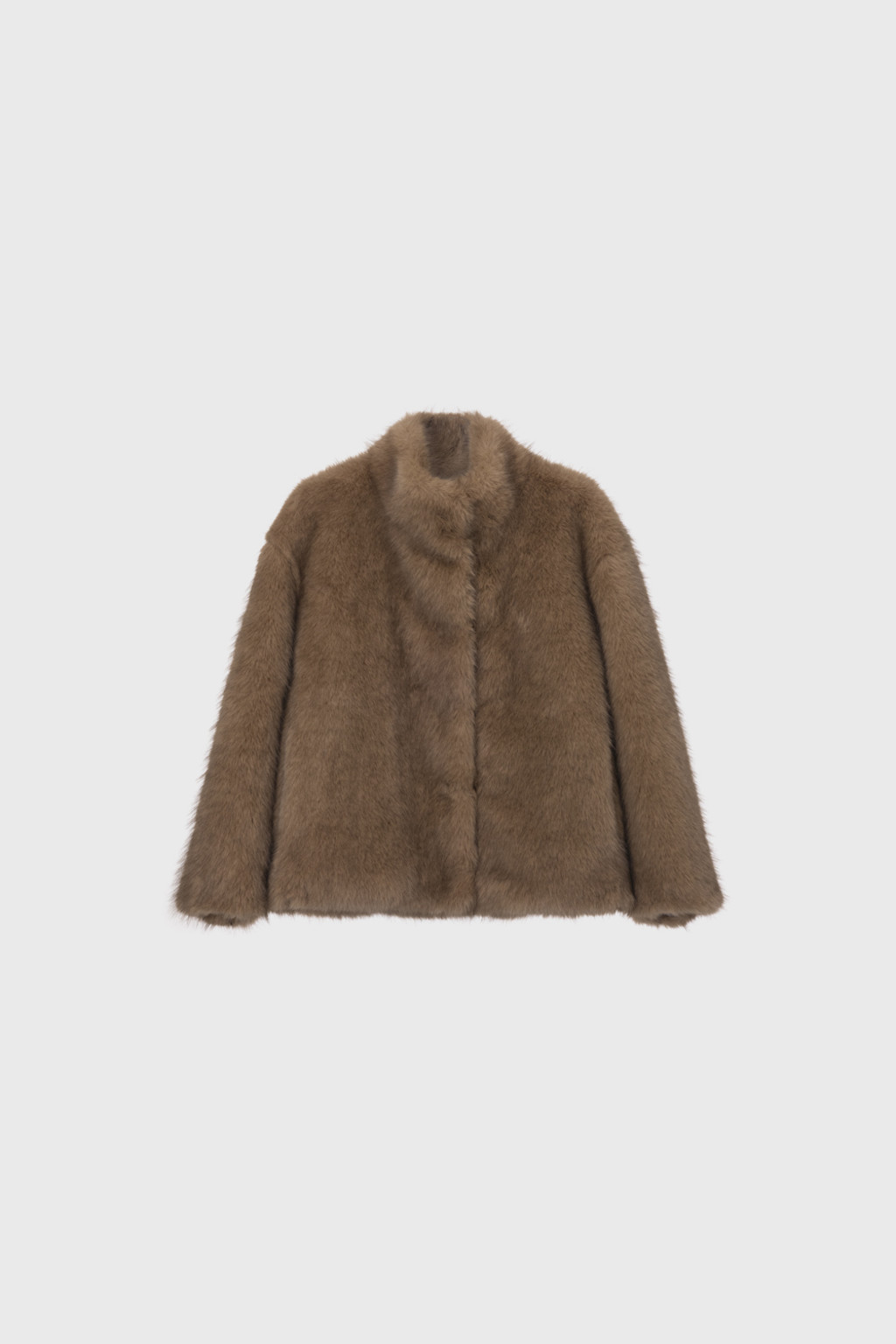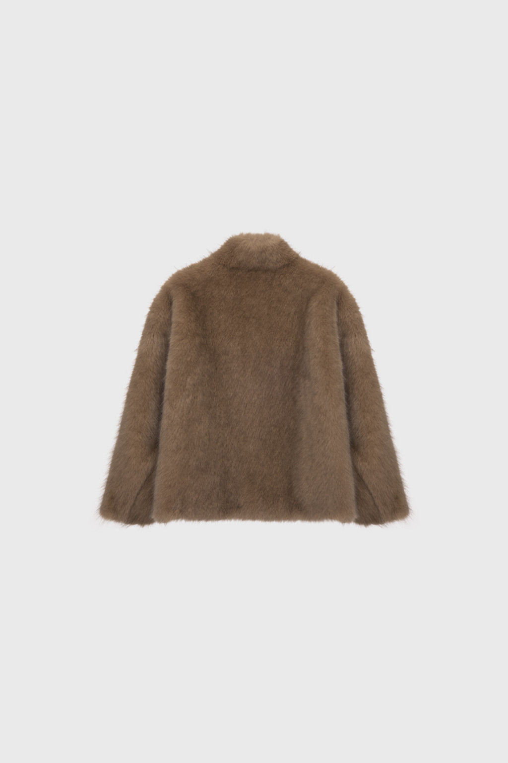 This half jacket is crafted from a soft and warm faux fur fabric that offers a cozy touch. The high-neck detail provides added warmth, while the hook closure keeps the exterior clean and minimal. Post-processing was applied to achieve an appropriate weight, and the full lining ensures a comfortable and stable fit. A drawstring detail at the hem allows for adjustable shaping, creating a voluminous blouson-style silhouette. Side pockets add practicality, and the length naturally covers the hips, making it a versatile piece perfect for transitional seasons through early winter.