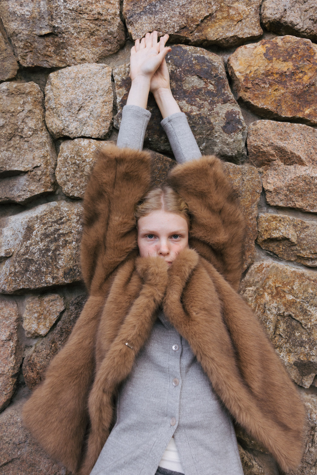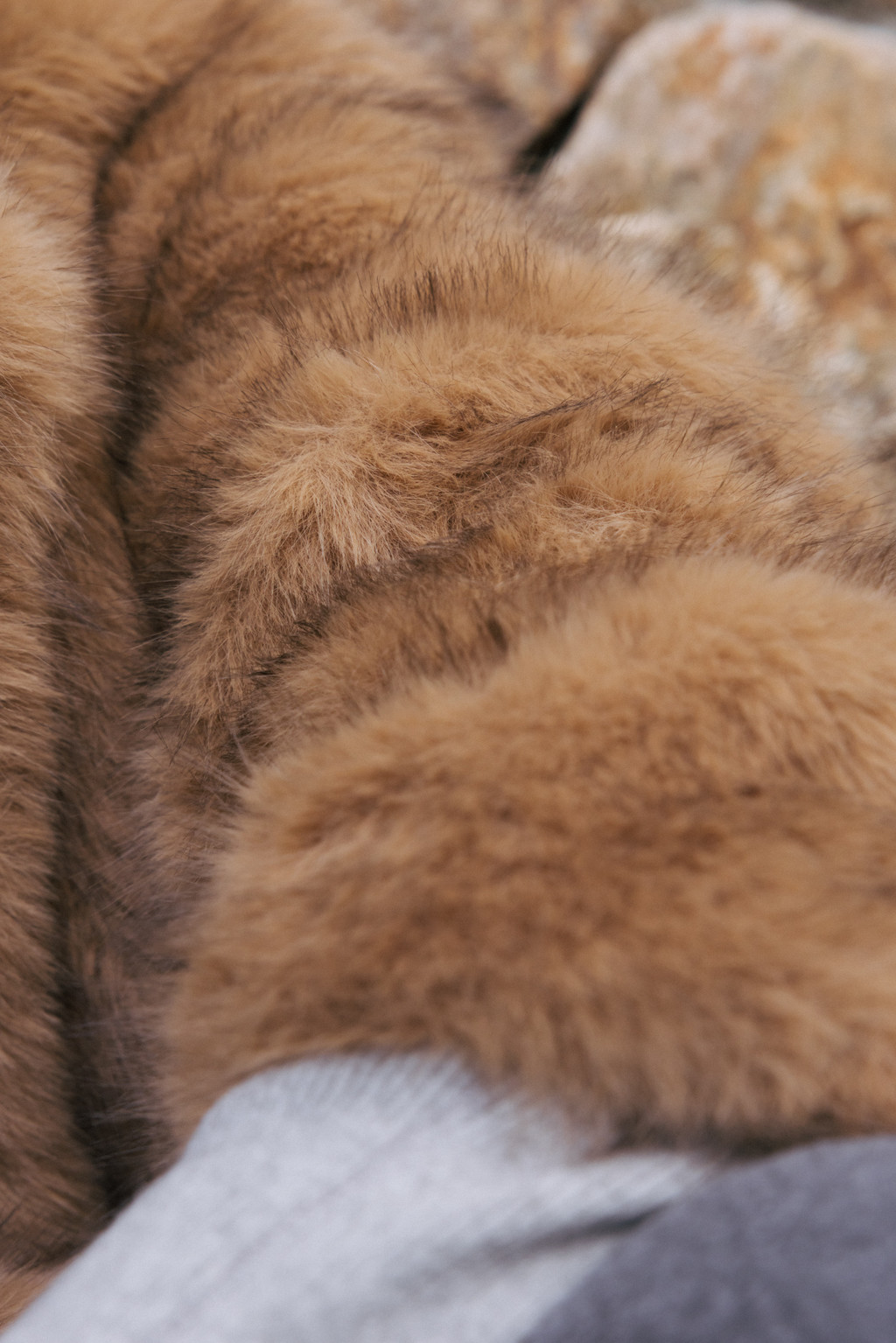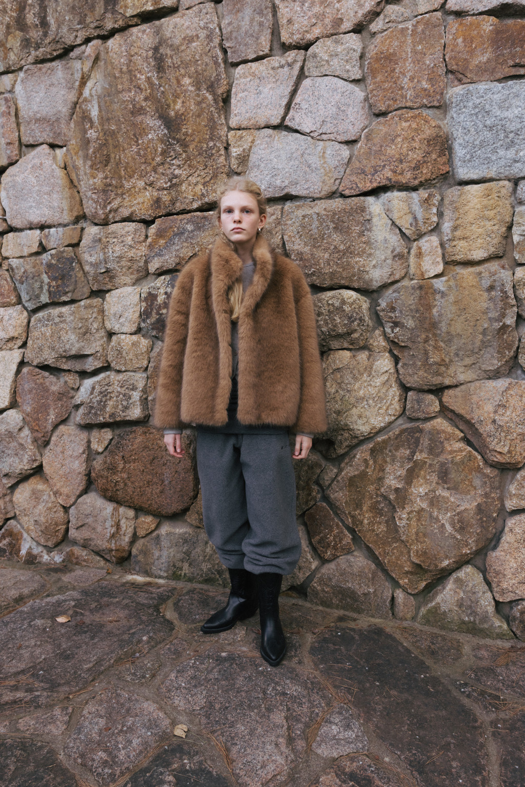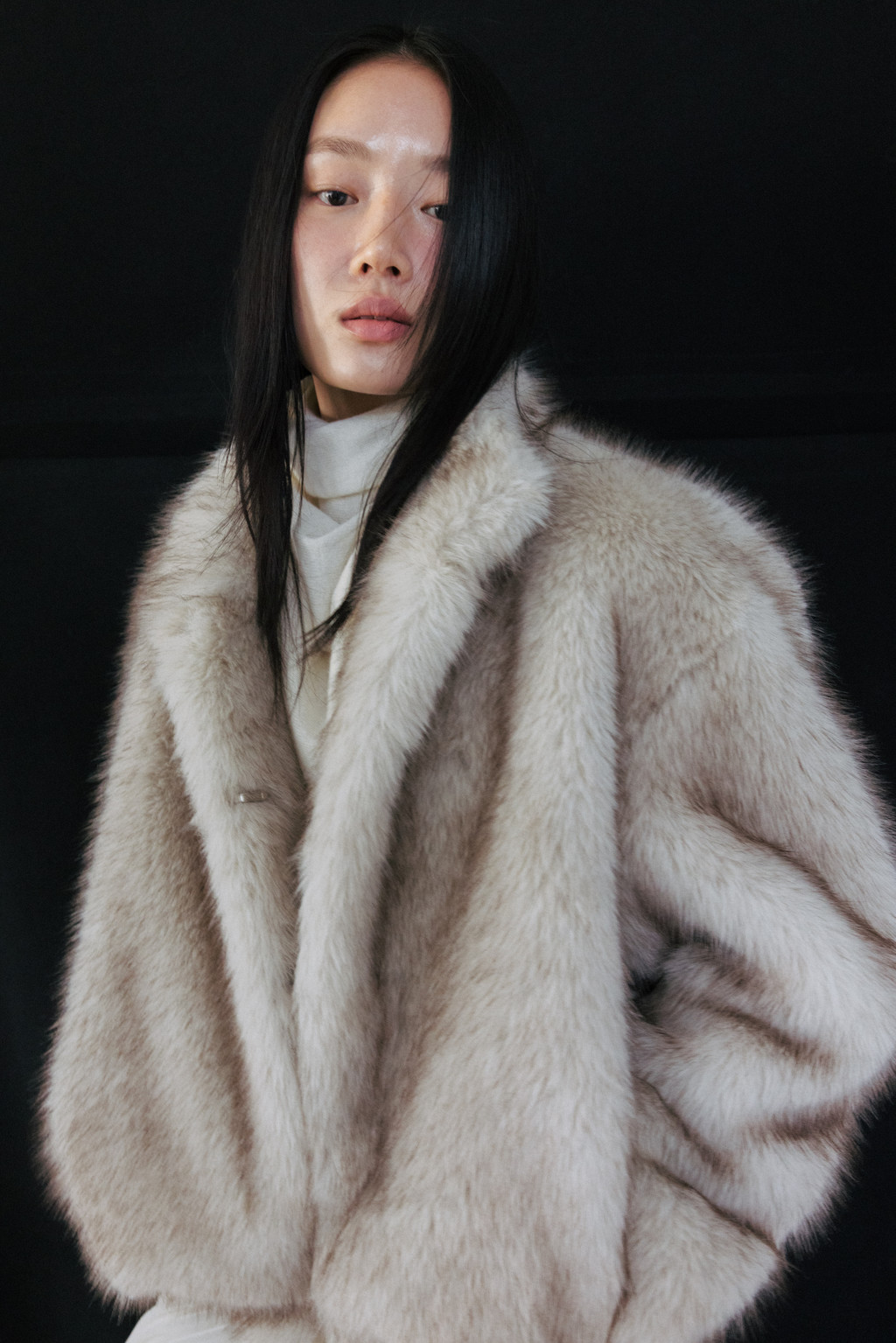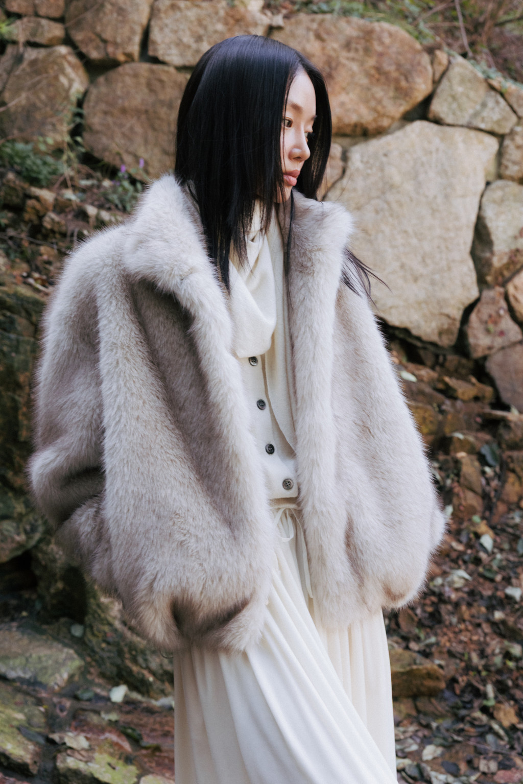 This half jacket is crafted from a soft and warm faux fur fabric that offers a cozy touch. The high-neck detail provides added warmth, while the hook closure keeps the exterior clean and minimal. Post-processing was applied to achieve an appropriate weight, and the full lining ensures a comfortable and stable fit. A drawstring detail at the hem allows for adjustable shaping, creating a voluminous blouson-style silhouette. Side pockets add practicality, and the length naturally covers the hips, making it a versatile piece perfect for transitional seasons through early winter.